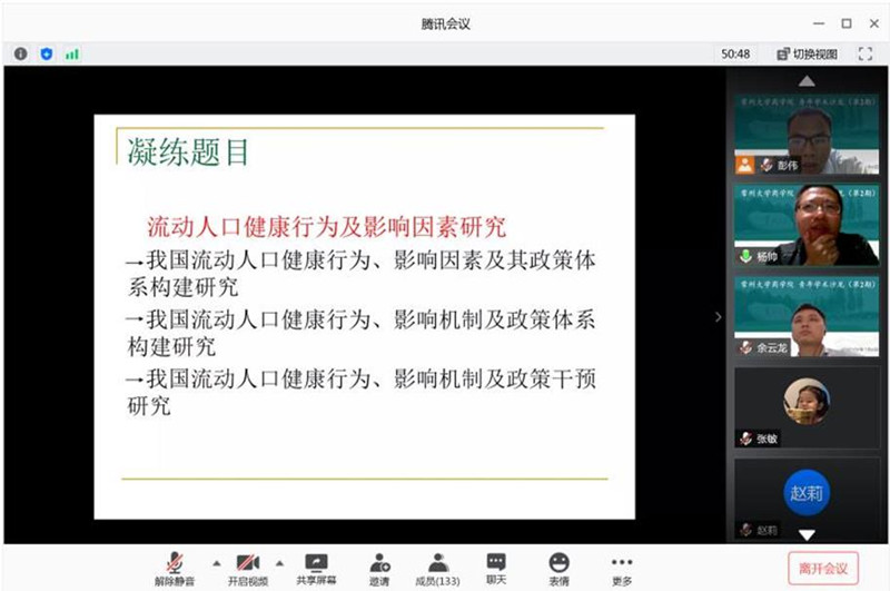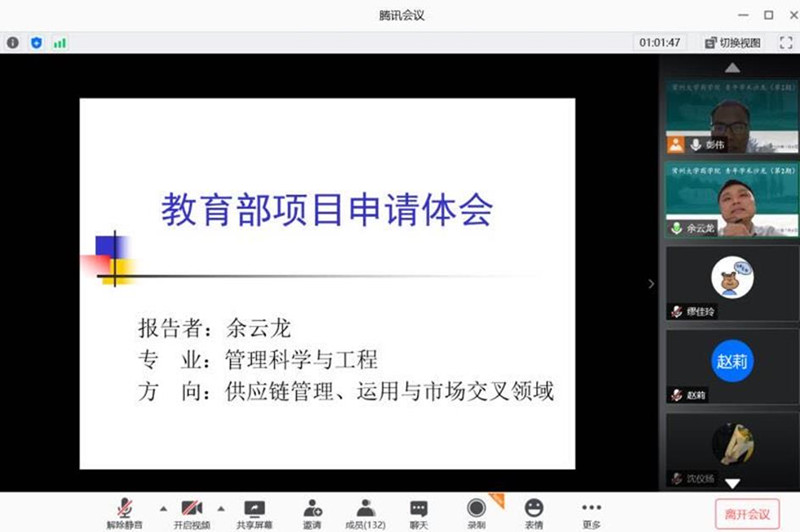 为营造良好的学术文化氛围,提高师生科研项目申报书的质量,常州大学商学院于7月8日晚上在“云端”举行第2期青年学术沙龙。本次沙龙由商学院杨帅博士和余云龙博士主讲,商学院党委书记江涛涛、副院长佟金萍与校内多个学院的130多名教师、研究生参加沙龙。沙龙由商学院副院长彭伟主持。 杨帅博士结合自己成功申报国家社科基金青年项目的经历,从“选题、查阅文献、确定研究思路、尝试撰写主要内容、凝练题目、学术史梳理、标书的修改”等七个方面,全面细致地分享了申报国家社科基金青年项目的技巧。随后,余云龙博士结合自己成功申报教育部人文社科青年项目的经历,从“项目信息、前期准备、申报书写作、申报书修改”等四个方面,围绕“总分、过渡、形式、内容”八个字深入讲解,分享了申报教育部人文社科基金青年项目的技巧。 历时两个小时的线上会议画面清晰、节奏顺畅,参会师生表示深受启发、倍受鼓舞。线上学术沙龙打破了时空的阻碍,增强了师生间的互动性,为师生们申报科研项目增添了信心与动力。 杨帅学术简介:法国雷恩第一大学经济学博士,现就职于常州大学商学院,主要研究领域为健康经济学,主持承担国家社科基金青年项目1项。 余云龙学术简介:南京大学管理学博士,现就职于常州大学商学院,主要研究领域为物流与供应链管理,主持承担教育部人文社科基金青年项目1项。