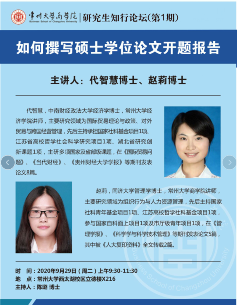 为提高研究生的科研素养,帮助研究生规范地开启毕业论文工作,商学院于9月29日上午在立德楼X216教室举行了首期研究生知行论坛。论坛主题为“如何撰写硕士学位论文开题报告”,经济学院代智慧博士和商学院赵莉博士担任主讲嘉宾,彭伟副院长和50余名研究生参加论坛。论坛由商学院陈璐博士主持。 彭伟副院长为研究生知行论坛开讲致辞。他指出,在新学期研究生座谈调研的基础上,学院经充分酝酿策划,适时推出研究生知行论坛,旨在帮助研究生同学既能掌握工商管理学科的理论前沿,又能知晓最新的工商管理实践。他希望研究生同学们要做到知行合一,积极开展“顶天立地”的科学研究,争做新时代的创新型商科人才。随后,代智慧博士围绕“硕士研究生学位选题”,结合自身科研经历从“学生态度、选题、选题依据、研究内容、研究方案”等多个方面就研究生在开题报告中遇到的方法问题和选题困惑进行了详细深入的阐释;赵莉博士从“文献综述困惑、文献搜索、文献阅读、文献综述写作”四个方面就研究生在论文开题中的具体写作疑问进行了系统科学的指导,并就顶级中英文管理类期刊进行了普及。最后,两位主讲嘉宾就参会同学疑问一一进行了解答,这对研究生增强文献阅读能力、了解国内外相关研究的发展现状具有重要的指导意义。 论坛历时将近两个小时,主题明确、气氛欢快、干货满满,使研究生对科学研究有了更深的理解与感悟,有助于研究生高质量完成硕士学位论文开题报告的撰写。