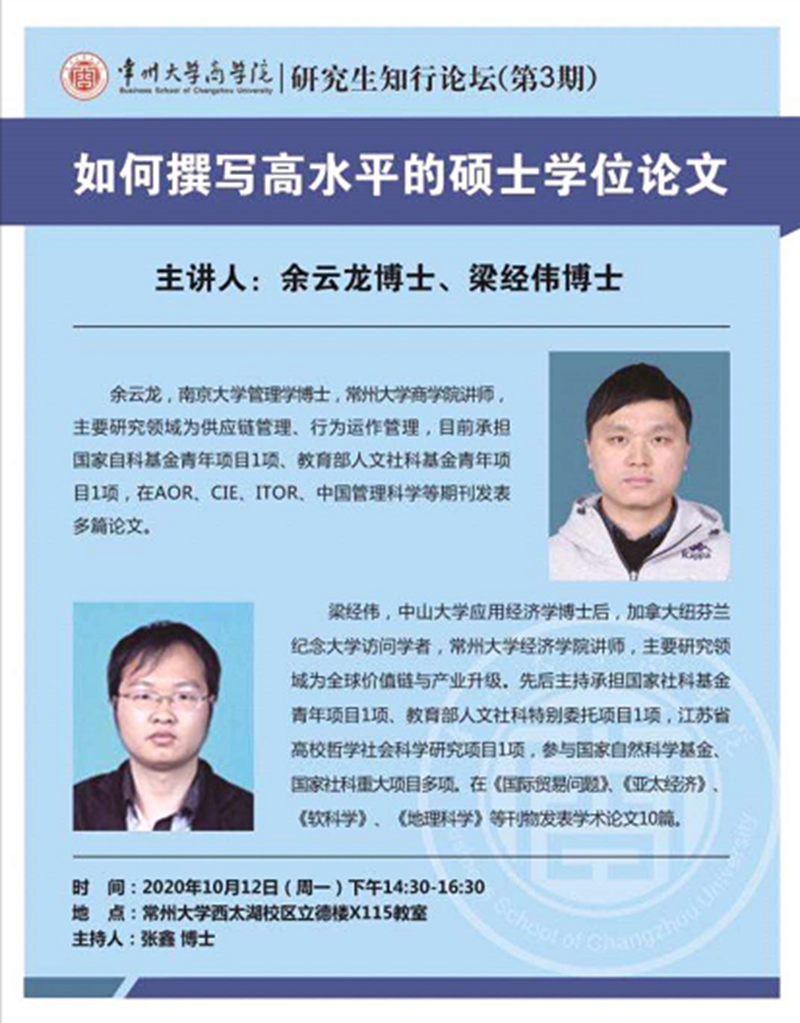 为进一步提升研究生的论文规范写作意识,提高学位论文的写作质量,商学院于10月12日下午在立德楼X115教室举行了第3期研究生知行论坛。论坛主题为“如何撰写高水平的硕士学位论文”,商学院余云龙博士和经济学院梁经伟博士担任主讲嘉宾,商学院50多名研究生参加论坛。论坛由张鑫博士主持。 余云龙博士结合自己学业生涯中的期刊论文写作经验和学位论文写作经验,从“期刊论文初稿写作、期刊论文投稿、学位论文写作”等三个方面系统科学地讲解了期刊论文初稿写作和学位论文写作的技巧和方法。随后,梁经伟博士结合自己在中山大学的博士后科研经历,从“论文写作的经验、论文投稿的经验、论文发表的案例、相关问题的交流”等四个方面,深入细致地分享了自己的论文投稿经验。最后,两位主讲嘉宾与参会同学进行了友好互动,并就同学们的学术疑问进行了解答,这对同学们的学术生涯规划和高质量论文写作具有积极的促进作用。 本次论坛历时近两个小时,讲解清晰、重点明确、气氛活跃,使广大商学院研究生对高质量论文写作有了更为系统科学的认识,有助于研究生撰写高质量的学术论文和高水平的学位论文。