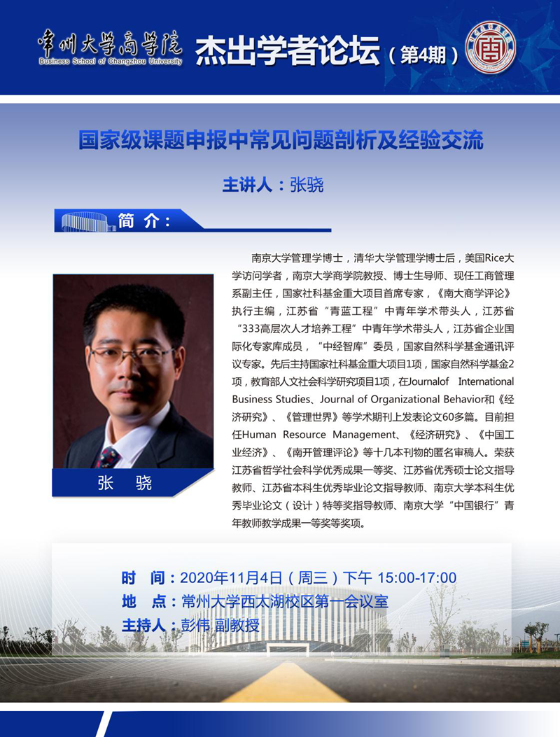 为进一步提高商学院老师国家课题申报书的写作质量,进而提升课题申报成功率,常州大学商学院于11月4日下午举行第4期杰出学者论坛,论坛在西太湖校区第一会议室举行。本次论坛的主题为“国家级课题申报中常见问题剖析及经验交流”,论坛由南京大学商学院张骁教授担任主讲嘉宾,共有30余名师生参与本次论坛。论坛由商学院副院长彭伟主持。 张骁教授基于自身自科项目、社科项目、教育部人文社科项目等的申报经验以及国家项目评议经历,从“三大类国家级项目的同与不同、三个层次项目的同与不同、自科基金近年申报的新变化及解读、一个成功申请书的必备条件、常见的几类错误打开方式以及申报心态与体会”等六个方面对国家级课题的申报步骤、写作注意事项及心态调整等问题进行了系统分享。随后,张骁教授与广大师生进行了互动交流,并对部分老师的选题进行了深入指导,为广大教师国家级课题申报提供了新视野。 本次论坛历时两个小时,主讲嘉宾诙谐幽默,现场气氛热烈、互动频繁,具有较强的学术指导意义和课题申报促进作用,为参与师生补充了大量默会知识,有助于激发商学院研究生的科研动力、提高其创新思维,也为商学院教师国家级课题申报提供了重要指导。