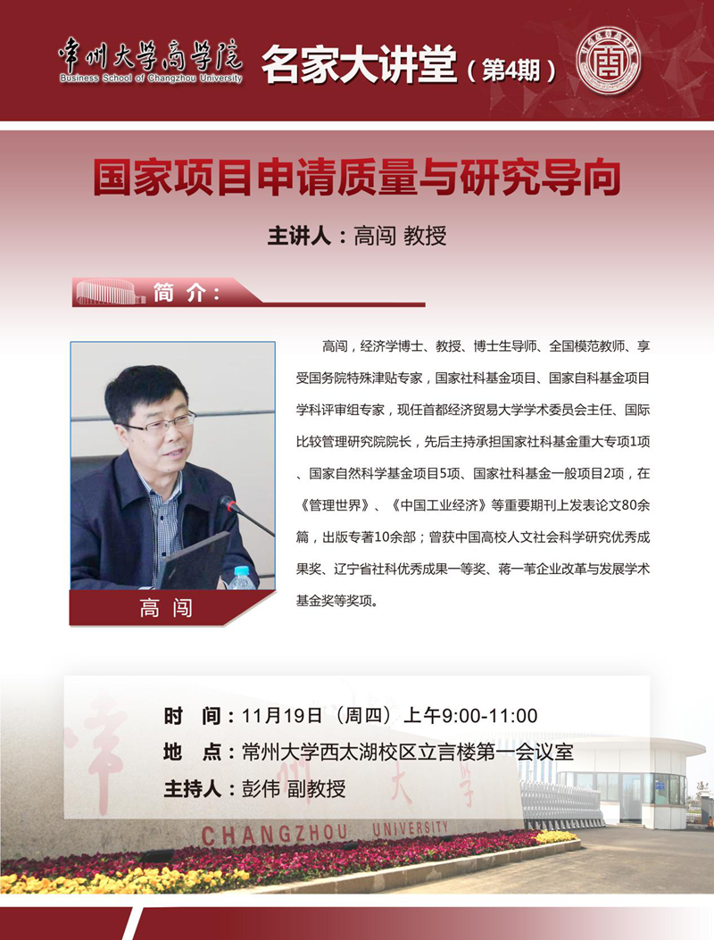 为正确把握国家项目的研究导向,争做高质量国家级课题研究,常州大学商学院于11月19日上午举行第4期名家大讲堂。本次名家大讲堂在西太湖校区立言楼第一会议室举行,主题为“国家项目申请质量与研究导向”,由首都经贸大学高闯教授担任主讲嘉宾,共有30余名师生参与本次名家大讲堂。讲堂由商学院副院长彭伟主持。 作为国家社科基金项目和国家自科基金项目学科评审组专家,高闯教授结合自身的项目申报经历和评审经验,从“两类基金项目的联系与区别、两类国家项目申报书的撰写以及关于国家项目选题的三个案例”等三个方面深入细致地讲解了国家社科基金和国家自科基金项目的申报方法、评审步骤及周期。随后,高闯教授与部分商学院教师进行了互动,就其国家基金项目选题进行了一一点评,为商学院教师把握研究导向、争做高质量研究提供了新视角。 本次讲堂历时近3个小时,主讲嘉宾妙语连珠,现场气氛欢快,互动频繁,精彩纷呈,极大扩充了商学院教师关于国家项目申报的知识储备,为其在新时代下争做高质量研究奠定了重要基础。