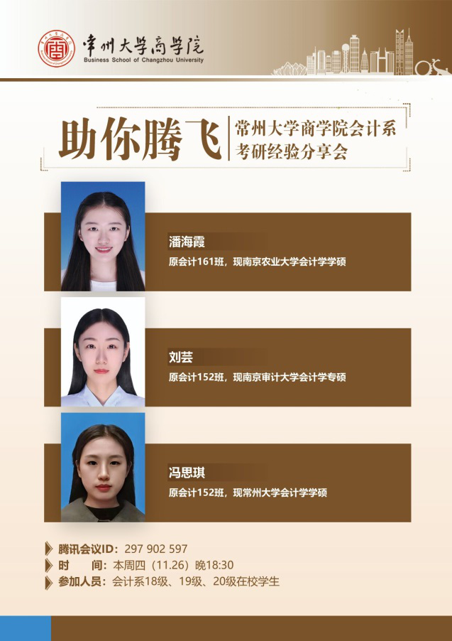 11月26日,会计系在腾讯会议上办了“助你腾飞:常州大学商学院会计系考研分享会”,讲座嘉宾是会计系往届成功考取研究生的三位同学:潘海霞、刘芸、冯思琪,整个分享会由张学伟和任优生两位老师主持,王文华副院长针对参会的18级和19级同学做了考研动员讲话。 分享的三位同学从不同方面讲了自己的择校经历、会计专硕和学硕抉择、备考过程的经验和教训、各科复习资料的获取、辅导班如何选择等问题。三位同学认真准备了分享课件,参会的18级和19级的同学纷纷表示从三位学姐身上感受到了锲而不舍的精神,同时获取了丰富的考研信息,对于后面的备考过程帮助很大。