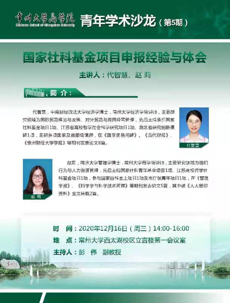 为鼓励老师踊跃申报国家社科基金项目,打造氛围浓厚的学术环境,常州大学商学院于12月16日下午在西太湖校区立言楼第一会议室举行第5期青年学术沙龙。本次沙龙主题是“国家社科基金项目申报经验与体会”,由经济学院代智慧博士和商学院赵莉博士担任主讲嘉宾,商学院彭伟副院长担任主持,商学院师生20余人参加此次沙龙。 代智慧博士首先以申报国家社科基金项目的亲身经历,从过程、选题、引言和心态等四个方面细致地分享了国家社科基金项目成功申报的经验和反思。随后,赵莉博士从思考选题、凝练标题、严密论证、关注细节和感悟等五个方面,并结合自己申报国家社科基金项目的全过程,深入分享了国家社科基金项目成功申报的心得体会。接着,两位博士和商学院老师展开了热烈的讨论,不同学科老师之间互相学习借鉴。最后,彭伟副院长对本次沙龙做了总结,就如何成功申报国家社科基金项目谈了三点体会:一是选题要好,项目选题是灵魂,要有高度、有深度、有宽度和有亮度;二是内容要实,项目内容是驱干,要写充分、写扎实、写全面、写深入;三是细节要美,要从评委的角度去构思申报书的每一个细节,做到无细节瑕疵。 本次青年学术沙龙历时将近2个小时,老师汇报和同行讨论相结合使得参会老师对国家社科基金项目成功申报有了更加深刻的理解和感悟,也使得不同学科老师之间的思维相互碰撞,为开展本学科项目申报汲取养分,以推动商学院国家社科基金项目成功申报的队伍不断壮大。