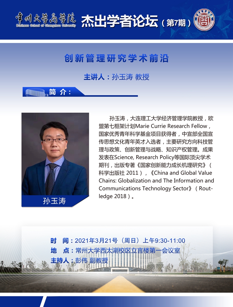 常州大学商学院于3月21日上午在立言楼第一会议室举办了第七期杰出学者论坛,主题是“创新管理研究的前沿”。本次论坛邀请到大连理工大学经济管理学院的孙玉涛教授担任主讲嘉宾,商学院30多名师生参与此次讲坛,论坛由商学院副院长彭伟老师主持。 孙玉涛教授以问题意识开场,沿着“是什么(What)、为什么(Why)以及怎么做(How)”三个方向解构创新管理研究。随后与在座师生分享经典书籍和重要文献,结合国内外研究的发展脉络及发展现状,解答“创新管理研究的前沿在哪里、创新管理研究的中国特色是什么”等问题。此外,孙教授还指出带着好奇心去发现并解决问题,对于扎实做科研十分有益。 本次论坛历时2个小时,主讲嘉宾结合自己的科研经历和科研成果,不但给我们讲述了创新管理研究,还与现场的师生积极互动,对于如何探索研究领域前沿的共性问题给出了自己的解答,思想的火花不断碰撞,有助于今后商学院师生进一步提升科研水平、提高科研质量。