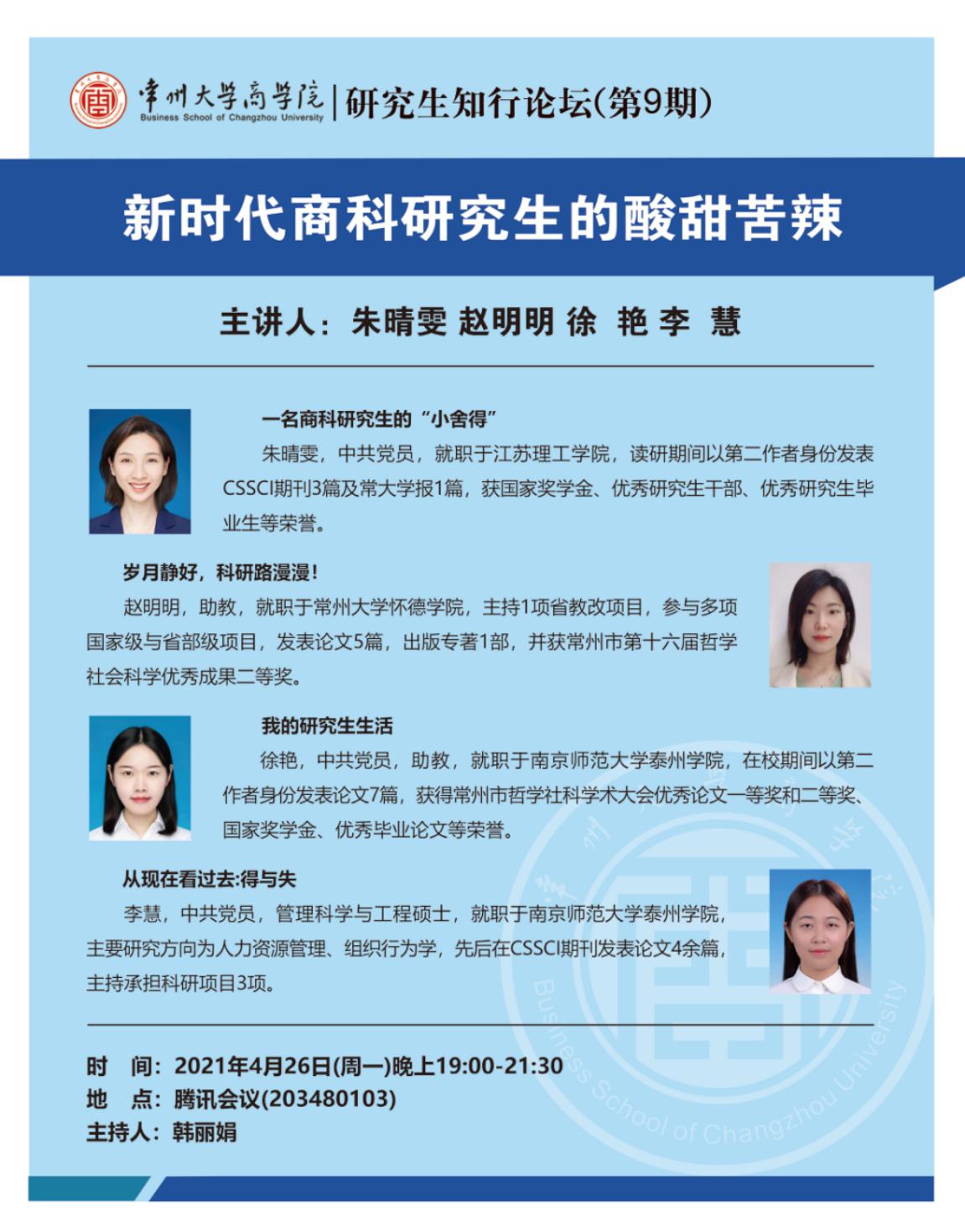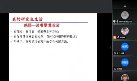 为帮助商学院研究生明确目标、提高学习能力、克服科研压力,商学院于4月26日晚上在腾讯会议举行了第9期研究生知行论坛。论坛主题为“新时代商科研究生的酸甜苦辣”,由常州大学优秀毕业生朱晴雯、赵明明、徐艳、李慧担任主讲嘉宾,商学院80余名研究生参加论坛。 朱晴雯学姐从如何提高自己的学习能力、抗压能力与逻辑思维三个方面谈了自己的感悟与经验;赵明明学姐为我们分享了如何克服科研道路上的压力以及如何更好地掌握科研方法,为我们做科研提供了借鉴;徐艳学姐从如何读书、如何提高表达能力、如何写论文以及论文的发表等各个方面分享自己的感悟与心得;李慧学姐从明确目标、主动学习、开阔眼界与健康生活四个方面谈了自己在研究生生活当中的感悟,使我们受益良多。随后,四位学姐就同学们的疑问耐心进行了解答。 本次线上会议历时近两个半小时,四位学姐结合自身经历为我们介绍了研究生阶段如何学习、如何写论文以及如何克服科研道路上的困难等内容,学姐们的分享使我们受益匪浅、收获满满,使研究生对自己的未来有了更加明确的目标,也更加坚定了自己的科研之路。