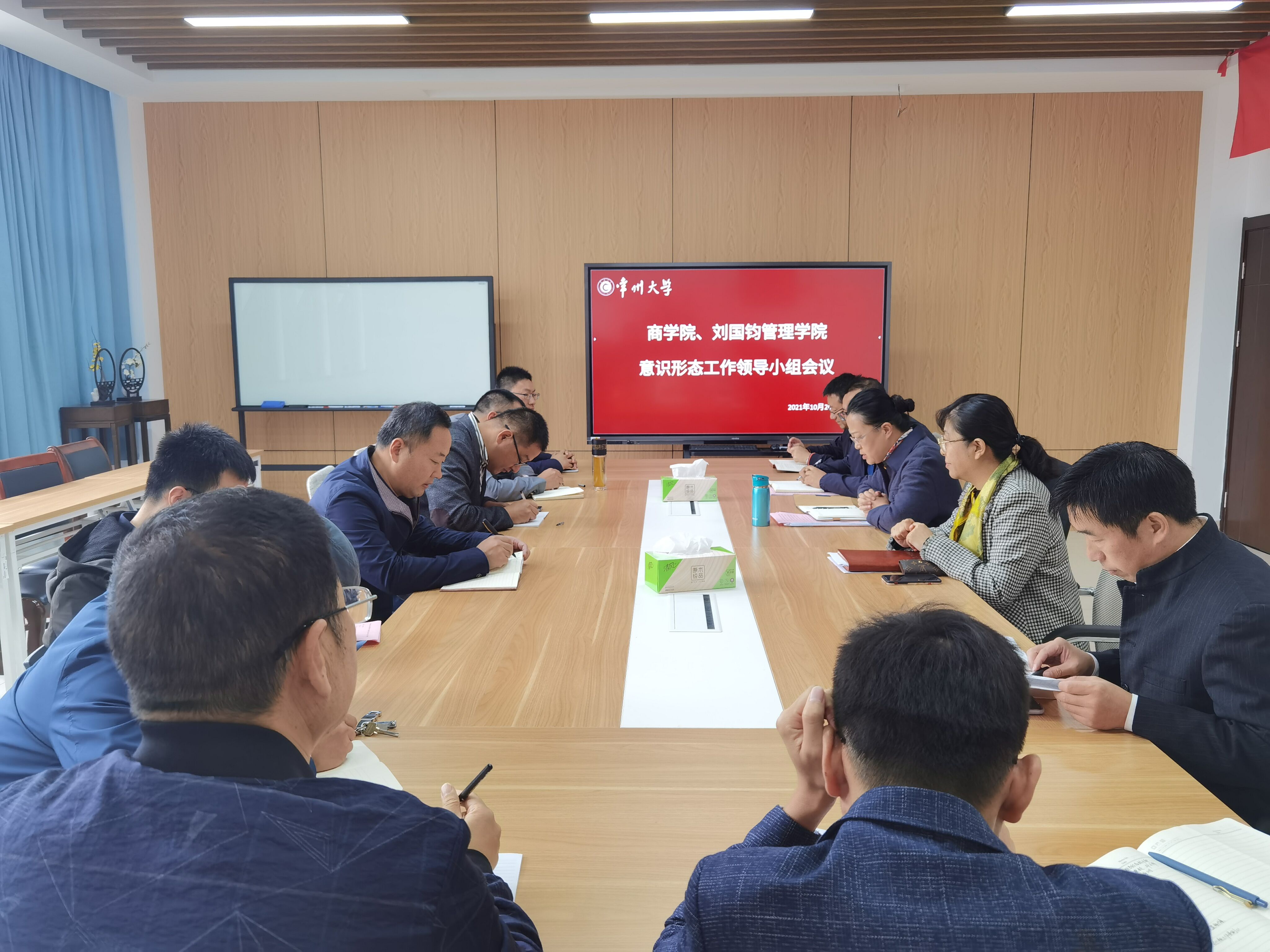 10月20日下午,商学院 刘国钧管理学院在立言楼321议室召开意识形态工作领导小组会议。院党委书记江涛涛、院长佟金萍、党委副书记林方毅、副院长彭伟、院长助理徐光伟、各系部主任、工会主席、院办主任、学工办主任、团委书记等意识形态工作领导小组成员参加会议。 会上,各系部负责人交流了本系部6月份以来意识形态领域开展的工作,并对下一阶段可能出现的问题和风险点进行了研判。 学院意识形态工作领导小组成员表示将结合实际定期研判意识形态工作面临的形势、师生中存在的重要舆情和突出问题,明确工作责任,细化工作举措,坚决防范各类事件的发生。