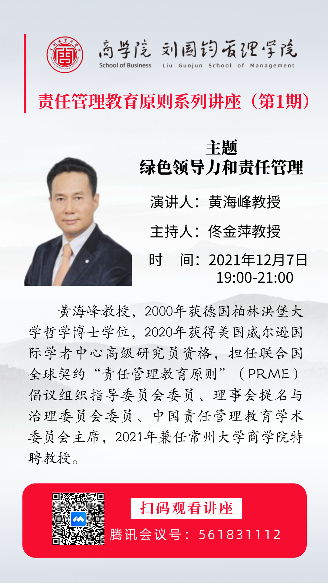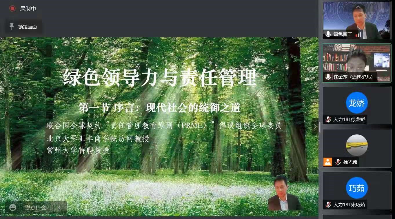 2021年12月7日19:00-21:00,商学院邀请特聘教授黄海峰为各年级同学做《绿色领导力和责任管理》线上讲座。佟金萍院长主持讲座,商学院近300位学生线上参与。 黄海峰教授是德国柏林洪堡大学哲学博士,获得美国威尔逊国际学者中心高级研究员资格,现担任联合国全球契约“责任管理教育原则”(PRME)倡议组织指导委员会委员、理事会提名与治理委员会委员、中国责任管理教育学术委员会主席,2021年兼任常州大学商学院特聘教授。 黄教授结合当今世界节能减排时代发展大势以及中国提出的“双碳”战略背景,立足组织管理领域绿色领导力研究现状,以其提出的核心理念和背景着手,为同学们系统介绍了绿色领导力的内涵,进一步结合具体案例深入浅出地分析了发展绿色领导力和责任管理的深远意义,以此探索了未来中国经济绿色转型之路。会后黄教授与同学们展开了精彩的问题互动,其精彩讲座使商学院的同学们受益匪浅。学院举办类似的讲座旨在培养同学们“绿色”责任意识,有效激励商学院学生立志争做当代有为绿色领导的远大志向。(通讯员:王怡菲)