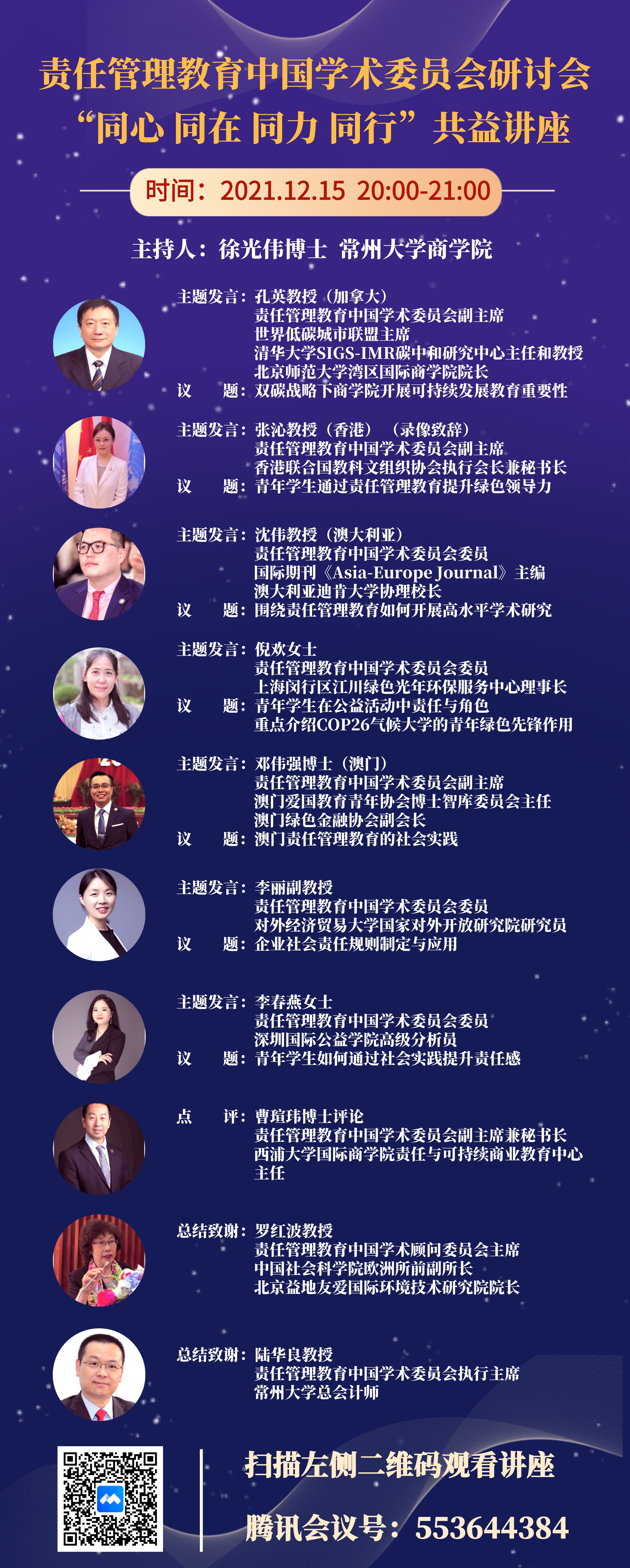 2021年12月15日,商学院面向本科生举办了一场线上讲座。会议邀请了香港联合国教科文组织张沁教授、澳大利亚迪肯大学沈伟教授、澳门绿色金融协会副会长邓伟强博士、清华大学孔英教授、对外经济贸易大学李丽副教授、绿色光年环保服务中心倪欢女士、深圳国际公益学院李春燕女士。七位专家学者围绕可持续发展、责任管理教育、社会责任等作主题发言。西交利物浦大学国际商学院曹瑄玮博士做主题评论。中国社会科学院欧洲所原副所长罗红波教授做总结发言。商学院本科生共计超过200位同学参与了线上讲座。 会议主题发言涉及青年学生通过责任管理教育提升绿色领导力、围绕责任管理教育如何开展高水平学术研究、澳门责任管理教育的社会实践、双碳战略下商学院开展可持续发展教育重要性、企业社会责任规则制定与应用、青年学生在公益活动中责任与角色、青年学生如何通过社会实践提升责任感。