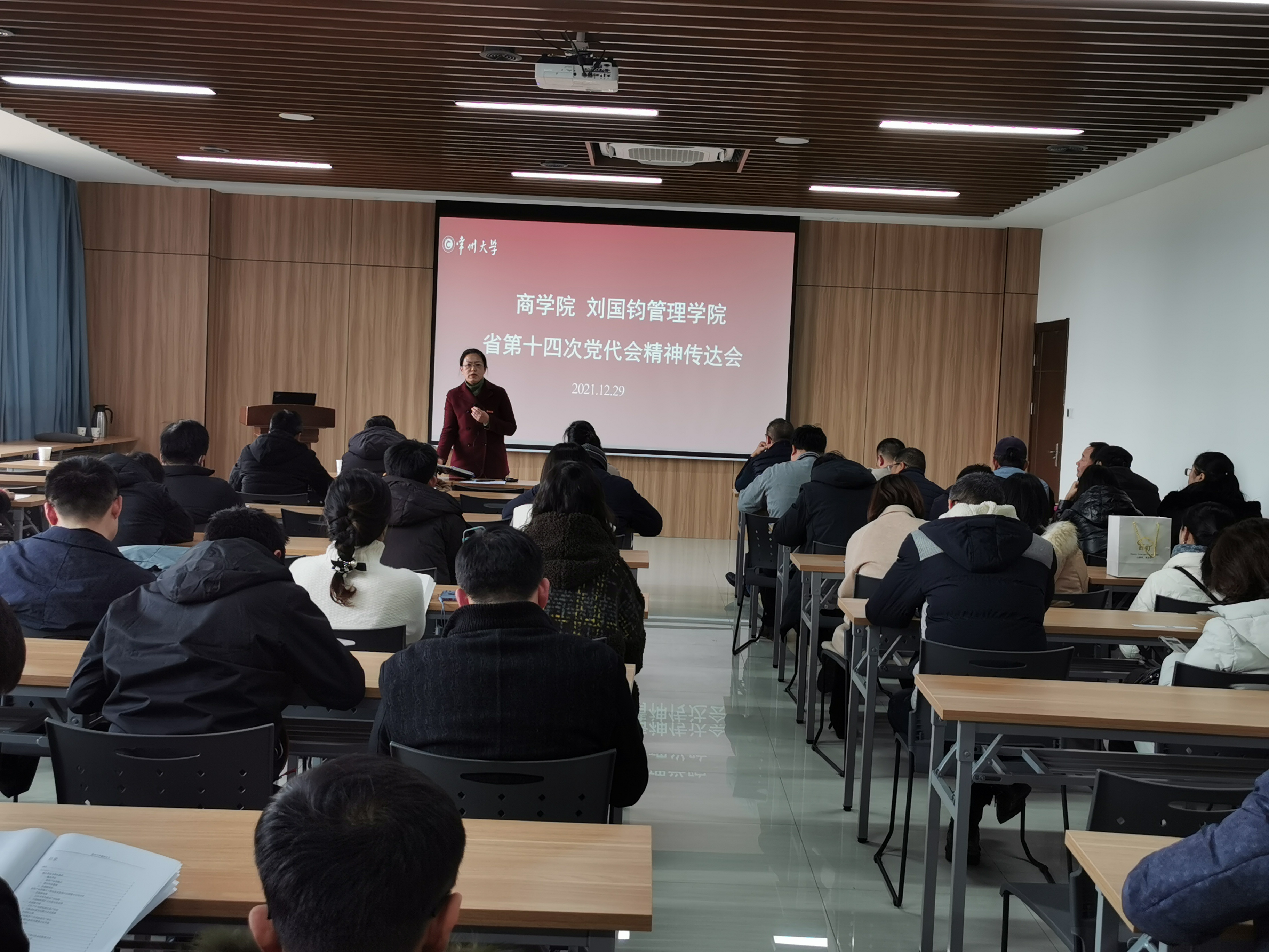 2021年12月29日,商学院在西太湖校区立言楼305多功能厅召开全院教师大会传达省第十四次党代会精神,会议由院党委书记江涛涛主持,商学院全体教职员工参加会议。 会上,江书记向全体教职员工传达了省第十四次党代会精神,并表示学院要结合总结本学期工作、研究谋划下学期工作思路紧密结合起来,努力增强学习贯彻党代会精神的针对性和实效性,另外对各部门业绩考核相关工作进行了部署安排。 江书记表示希望全体教职员工按照学校、学院要求,继续做好教学、科研等各项工作,为学院高质量发展贡献力量。