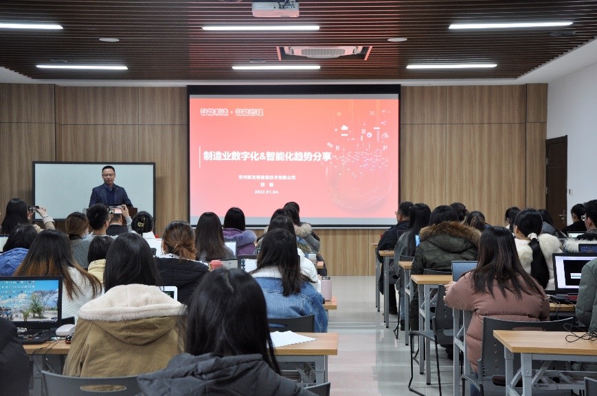 为了进一步培养智能制造业领域新生力量,共赴时代新征程,常州大学商学院、刘国钧管理学院与常州新友畅信息技术有限公司进一步深化校企合作,第一届智能制造应用技术实训班培训活动暨开班仪式于2022年1月4日在立言楼305教室举行。常州大学商学院副院长刘建刚教授、常州新友畅信息技术有限公司总经理纪小冬、副总经理郑新,学院骨干教师以及公司部门经理、骨干出席本次活动。