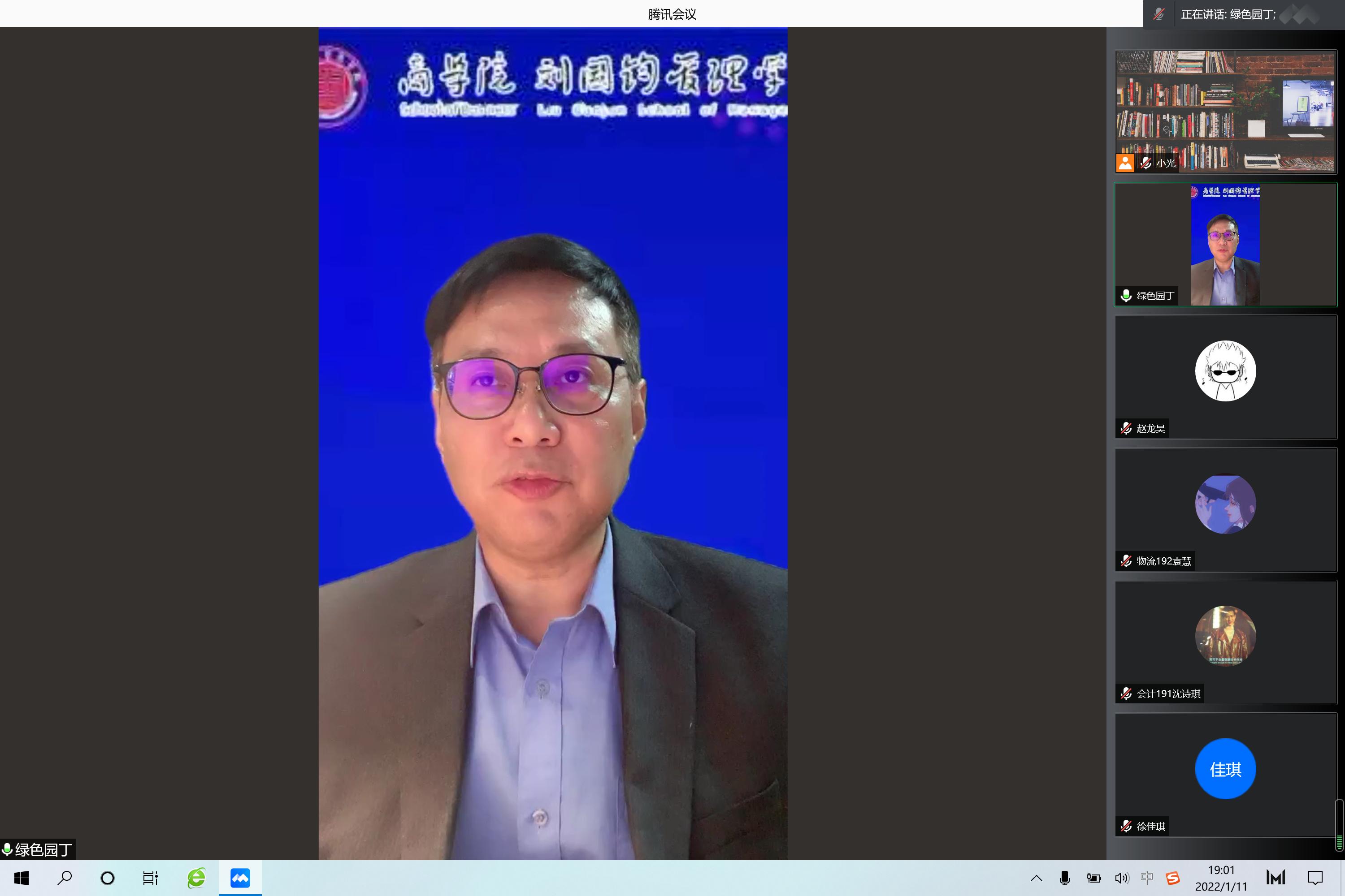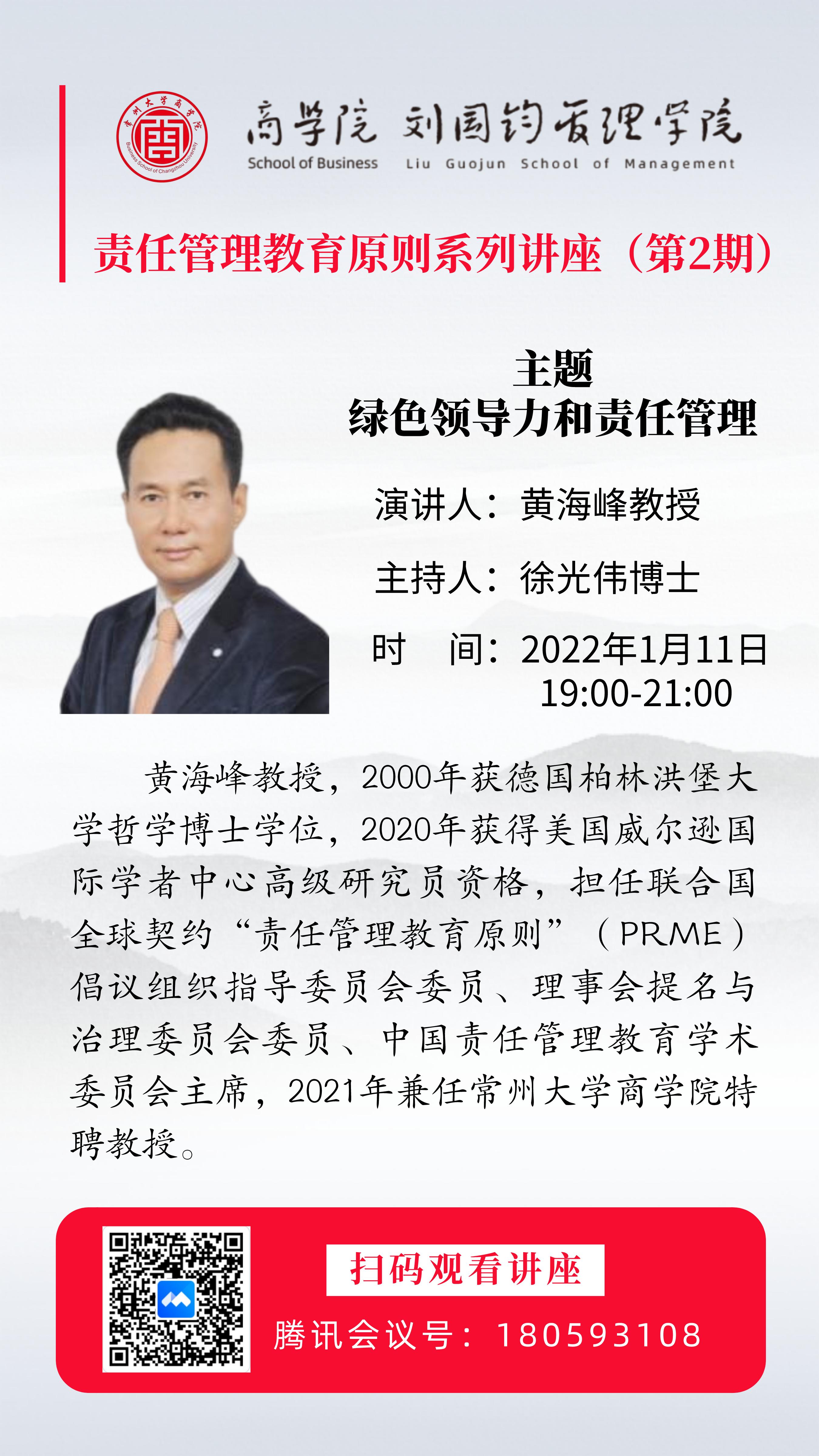 2022年1月11日19:00-21:00,商学院邀请特聘教授黄海峰为各年级同学做《绿色领导力和责任管理》线上讲座。徐光伟博士主持讲座,商学院近300位学生线上参与。 黄海峰教授是德国柏林洪堡大学哲学博士,获得美国威尔逊国际学者中心高级研究员资格,现担任联合国全球契约“责任管理教育原则”(PRME)倡议组织指导委员会委员、理事会提名与治理委员会委员、中国责任管理教育学术委员会主席,2021年兼任常州大学商学院特聘教授。 本次讲座黄教授首先从领导文化与教育主题展开,从文化视角阐述了领导文化与当代教育的内在联系。进一步,黄教授又从社会责任着手,叙述了责任管理教育对于当今中国社会的现实意义。本次讲座为商学院的同学们树立了健康积极的责任价值观,同时也提升了同学们的就业能力和未来职业发展竞争力。