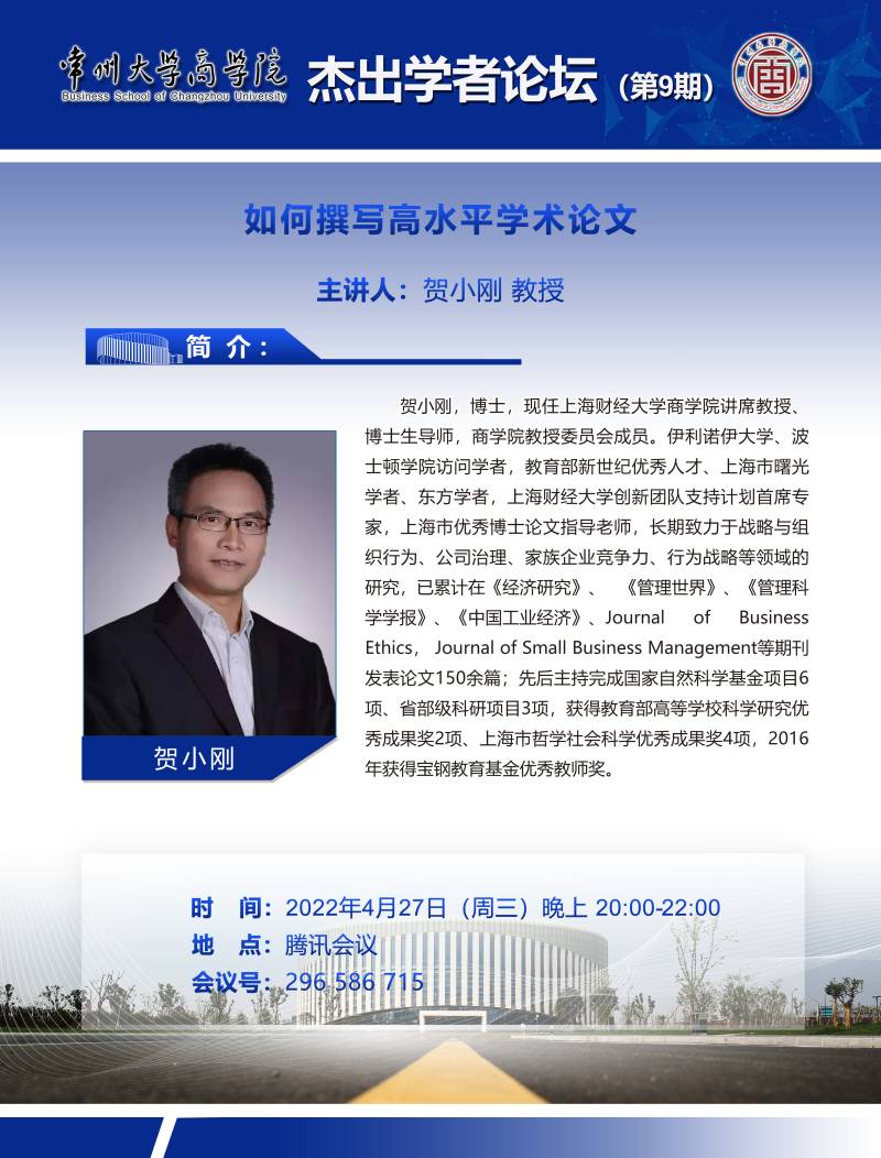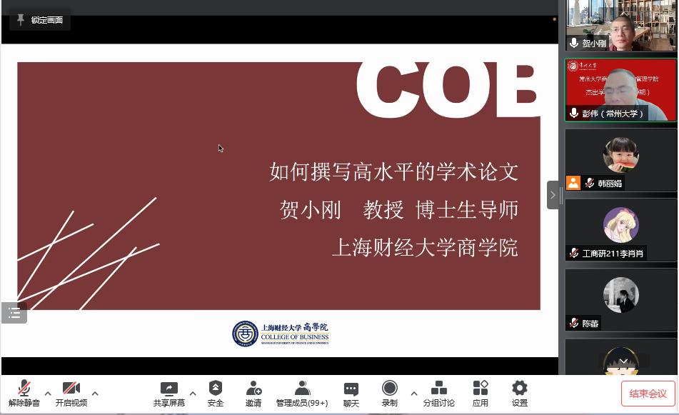 为帮助商学院广大师生撰写高水平学术论文,提高论文写作能力,常州大学商学院第9期杰出学者论坛于4月27日晚上在腾讯会议举行。论坛主题为“如何撰写高水平学术论文”,上海财经大学商学院讲席教授贺小刚担任主讲嘉宾,商学院130余名师生参加此次论坛。 贺小刚教授结合自己的科研经历,从研究选题、主题表现方式、论文分享与期刊选择等几个方面深入系统地为我们分享了高水平论文的写作技巧。首先,贺教授指出好的选题是成功的一半,一个好的选题不仅要体现新颖性与创新性,而且立意要高,要体现国家与社会需求;其次,要做到好的选题不仅要把握理论前沿,还需要深刻理解社会现象;然后,论文的写作还需要我们不断拓宽自己的视野和领域;最后,贺教授还为我们分享了几篇优秀的论文,拓展了我们的视野。贺教授的讲座精彩绝伦、引人入胜,是一场有高度、有广度、有深度的学术盛宴,令广大师生受益匪浅、收获颇丰。 本次论坛历时近两个小时,重点突出、深入浅出、干货满满,参会师生受益匪浅,收获满满,使商学院广大师生对论文的选题与写作有了更深刻的认识,有助于商学院师生提高学术能力与学术素养、撰写高水平的学术论文。
