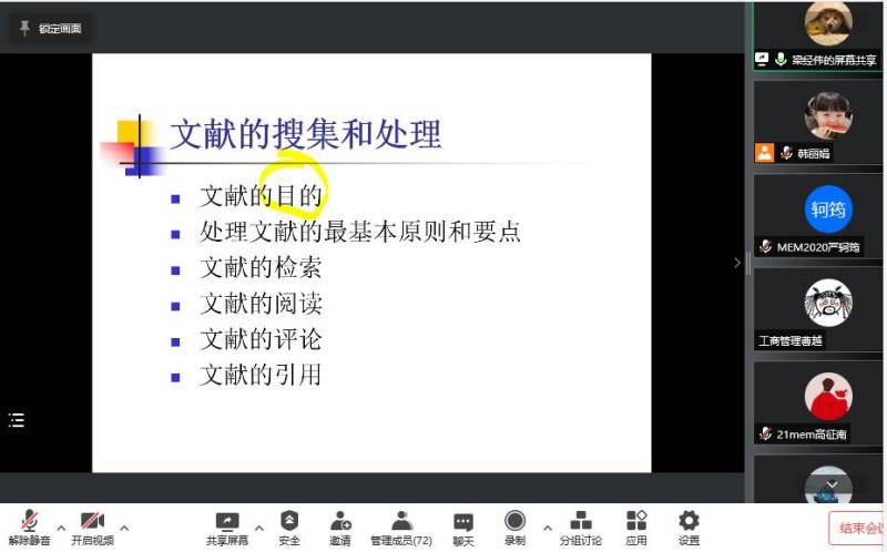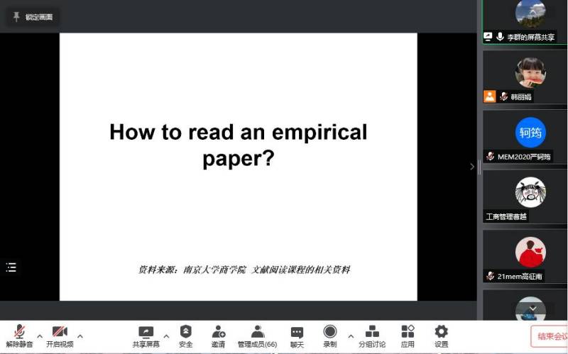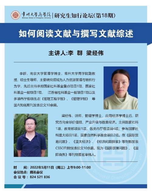 为规范商学院研究生文献综述的撰写、进一步提高论文写作质量,常州大学商学院第18期研究生知行论坛于5月11日上午在腾讯会议举行。论坛主题为“如何阅读文献与撰写文献综述”,由商学院硕士生导师李群博士和梁经伟博士担任主讲嘉宾,商学院近70余名研究生参加此次论坛。 李老师结合自己的科研经验为我们非常详细地分享了国内外重要期刊的类型、文献阅读的要点与注意事项等各个方面。梁老师以经济学科为例,从文献的检索、文献的阅读、文献的评述以及引用等各个方面详细的讲解了如何撰写规范的文献综述。两位老师都指出一个好的学术研究包括新颖的选题、适当的方法、好的数据与优美的文笔。两位老师的讲座精彩绝伦,使同学们受益匪浅,收获满满,有利于帮助同学们更高效地阅读文献,同时也为同学们撰写高质量的学术论文提供了建设性的指导与建议。随后,两位老师与同学们进行了互动交流,并就同学们的疑问耐心地进行了解答。 本次论坛历时近两个小时,主讲嘉宾妙语连珠、绘声绘色,论坛内容充实、引人入胜,使商学院研究生深入学习了如何高效阅读文献以及撰写规范的文献综述,有利于帮助研究生规范撰写文献综述、提高论文写作质量。
