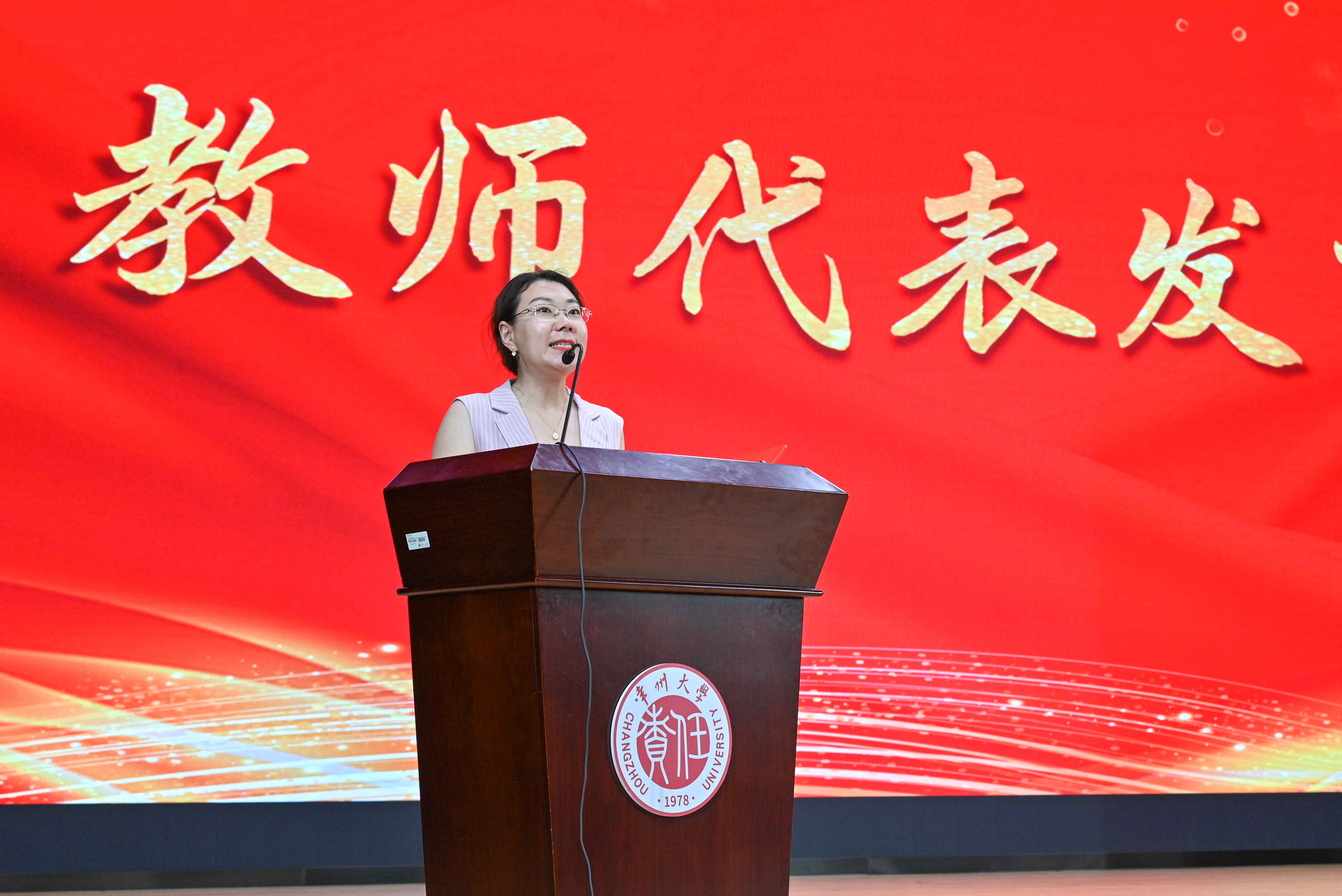 在第三篇章《砥砺奋进 筑梦未来》中,商学院教师代表会计181班主任谭瑾老师发言,向毕业生表达了祝贺,也寄予了期许。她以“饼”为比喻,赞美毕业学子用自己的努力拼出了一张“大饼”,这张大饼足以裹腹,味道可能寡淡,却足以充实自己的行囊。谭瑾老师祝愿同学们以心有猛虎细嗅蔷薇的态度去体验和收集各自精彩人生的五味杂陈,卷出一张层次丰富,美味的人生之“饼”。后以“会计循环”为例,说明人生阶段又何尝不是一种循环,在“画饼、摊饼和卷饼”不断的循环中,螺旋式上升前进。