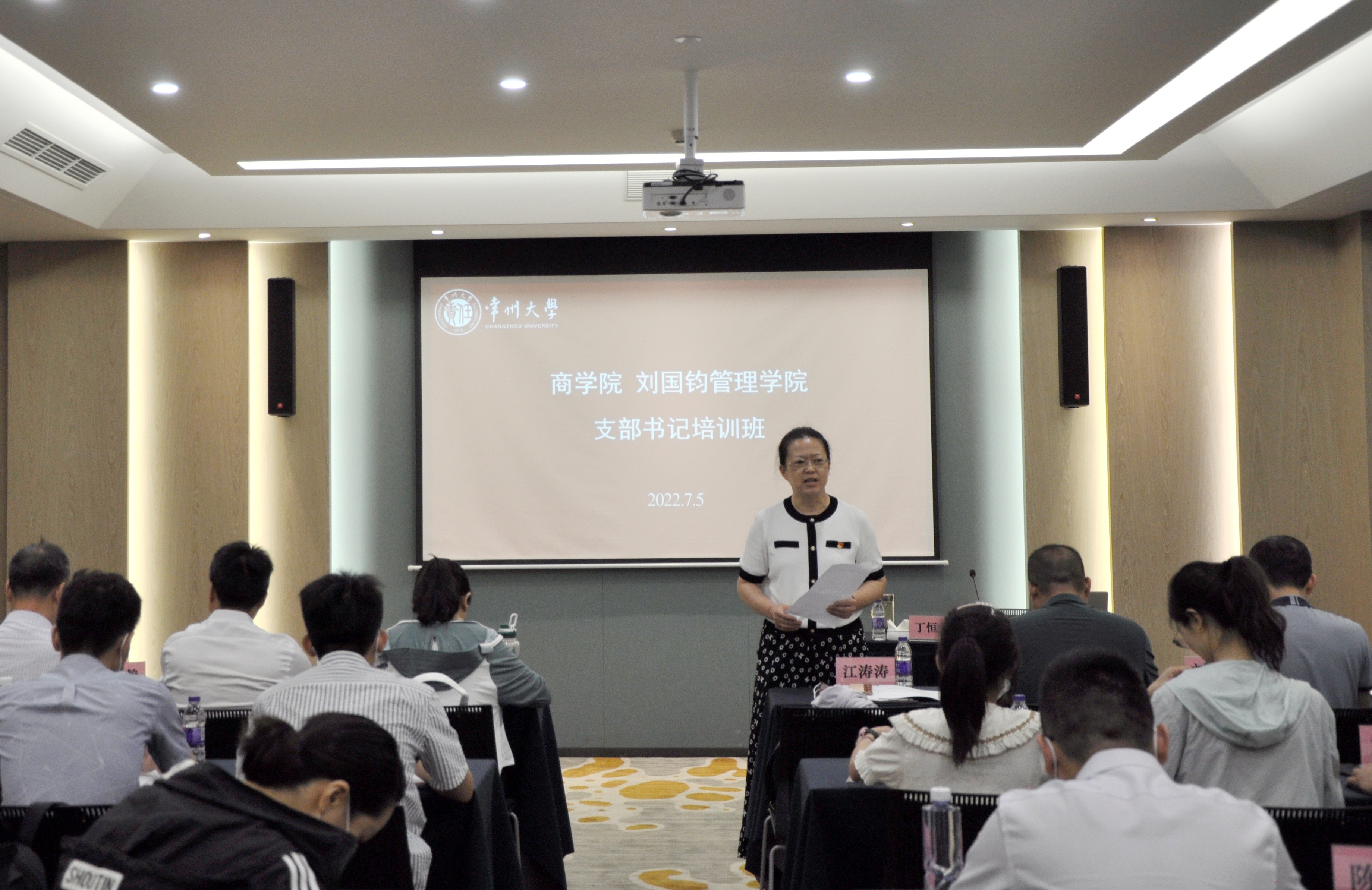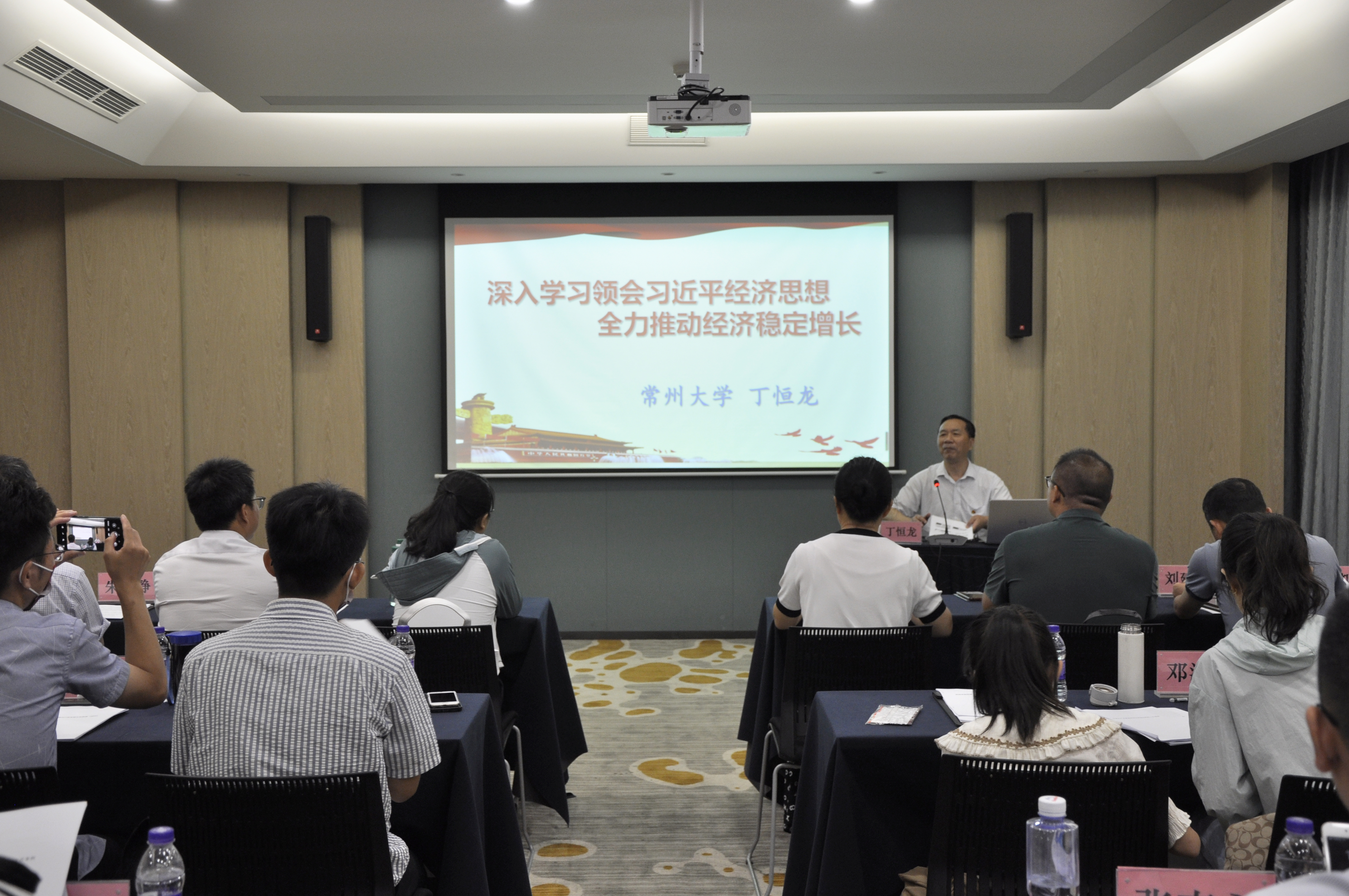 学院党委书记江涛涛做动员讲话 培训首日安排了理论学习、参观、调研等活动。 常州大学丁恒龙教授分别围绕《中国共产党普通高等学校基层组织工作条例》(以下简称《条例》)、习近平经济思想等内容开始首场培训。丁恒龙介绍了《条例》修订的背景及过程,并对《条例》进行了细致分析和深入解读。他还从现实意义、核心要义、理论特征等方面对习近平经济思想进行阐释,他认为习近平经济思想赋予了中国特色社会主义经济发展道路的新内涵,开拓了马克思主义政治经济学的新境界,为我国经济持续健康发展提供了新指南。丁恒龙勉励培训学员要强化政治意识,履行政治职责,把党的领导落实到教学管理的各个方面,以实际行动把党中央决策部署落实到位,凝心聚力,迎接党的二十大胜利召开。