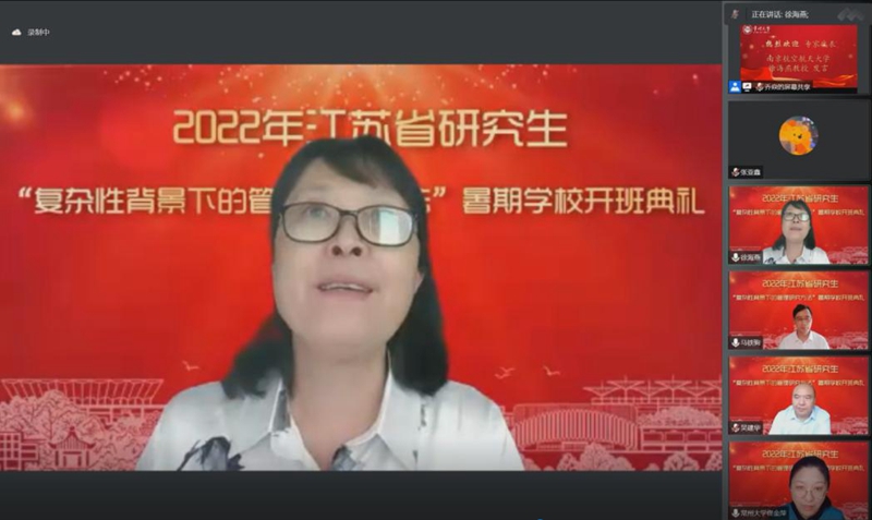 2022年江苏省研究生“复杂性背景下的管理研究方法”暑期学校开班典礼 江苏省管理学类研究生教育指导委员会副主任、南京大学吴建华教授,常州大学党委常委、总会计师陆华良教授,江苏省管理学类研究生教育指导委员会秘书长、东南大学张玉林教授,长江学者、华东理工大学商学院院长马铁驹教授,南京航空航天大学徐海燕教授,常州大学研究生院王龙耀院长,常州大学研究生院刘江珅副院长等多名专家学者出席本次线上举行的开班典礼,常州大学商学院院长佟金萍教授主持本次开班典礼。