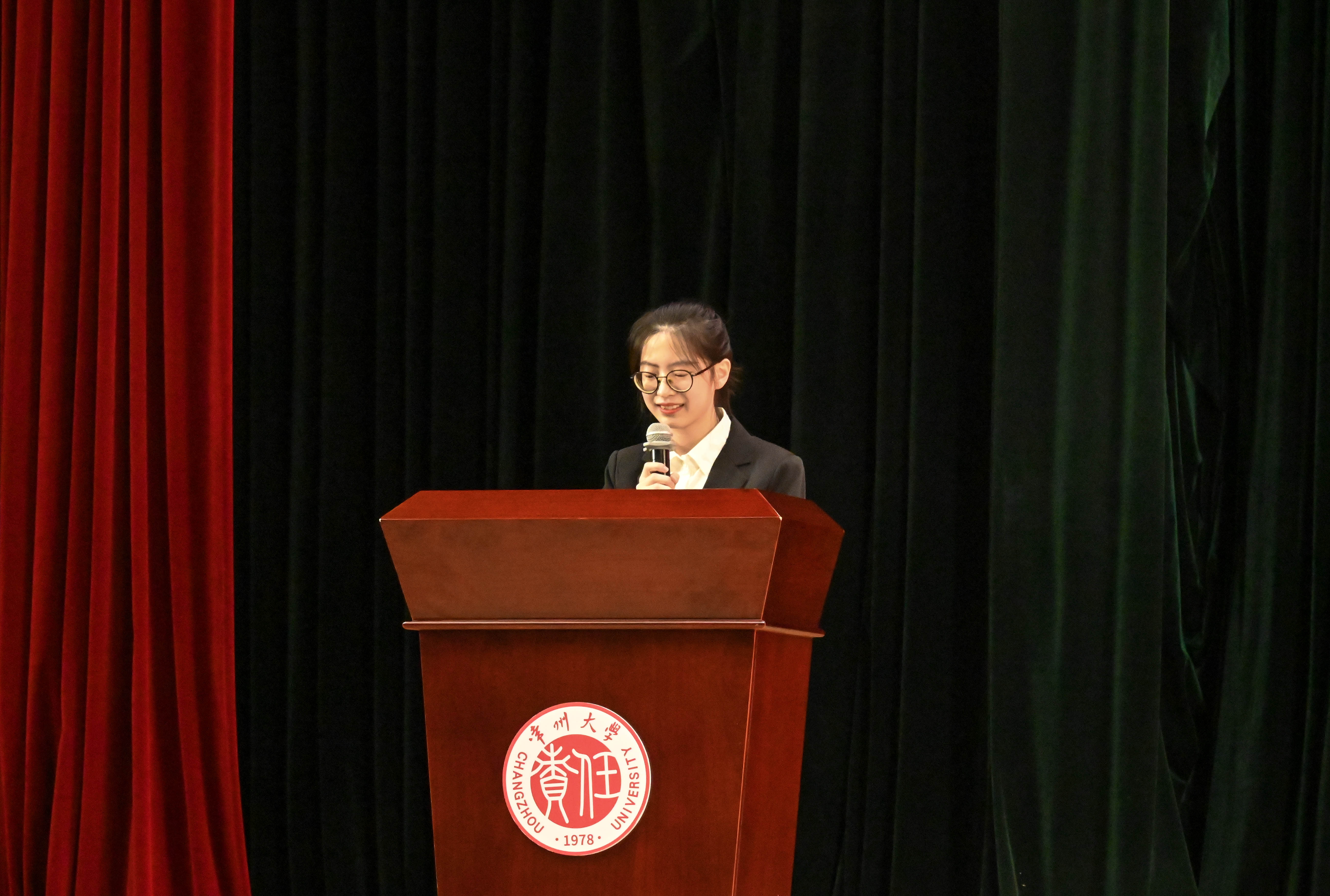 全体起立 合唱国歌 少年何妨梦摘星 敢挽桑弓射玉衡 人力221班李田峣作为本科新生代表发言。她认为,面对新学期、新征程,常州大学商学院学生要继承刘国钧先生的责任与担当,融入社会前进洪流,体现商科青年的才学和情怀。同时李田峣代表新生作出承诺:在今后的学习生活中会明确目标,进行自主创新;博采众长,做到厚积薄发;修身立德,而后志存高远。