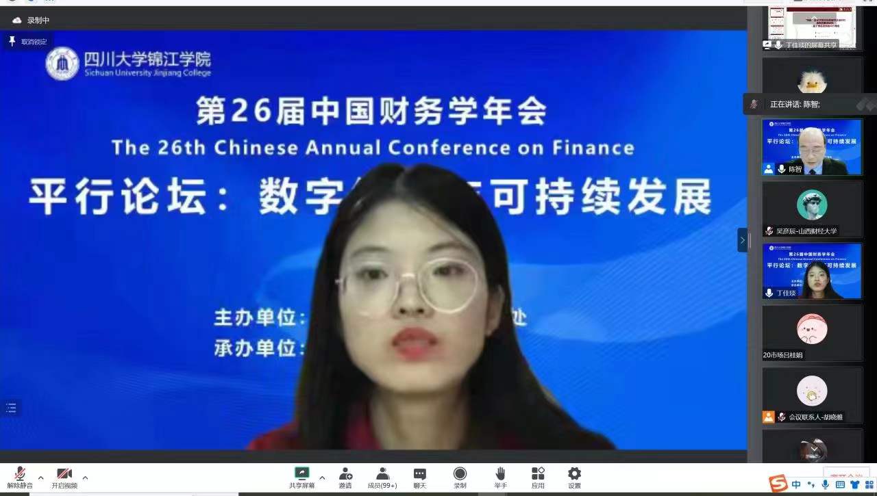 11月26日,由中国财务学年会秘书处主办、四川大学锦江学院承办的第26届中国财务学年会在锦江学院举行。来自南京大学、浙江大学、四川大学、厦门大学、中南财经政法大学、华中师范大学、华中科技大学、上海对外经贸大学、上海财经大学、西南财经大学、海南大学等全国近50所高校、科研院所的代表参加了此次学术年会。会议以线上线下相结合的方式举行,超6000人参与线上直播会议,创历届参会人数之最。年会以“数字经济与财务理论创新”为主题,分主题报告和平行分论坛两大部分。年会共设三个平行分论坛,从来自70余所高校的150余篇投稿论文中遴选出30篇论文予以报告点评。 我院王文华教授指导的研究生丁佳琰同学论文入选并应邀参会做论文汇报,汇报论文题为《“双碳”目标下数字化转型对企业ESG表现的影响研究—基于绿色创新的中介视角》(指导老师:王文华教授),丁佳琰同学分别从研究背景、研究假设、样本选择与研究设计、实证结果、研究结论和研究贡献这六个方面介绍该篇论文的写作思路和基本内容。