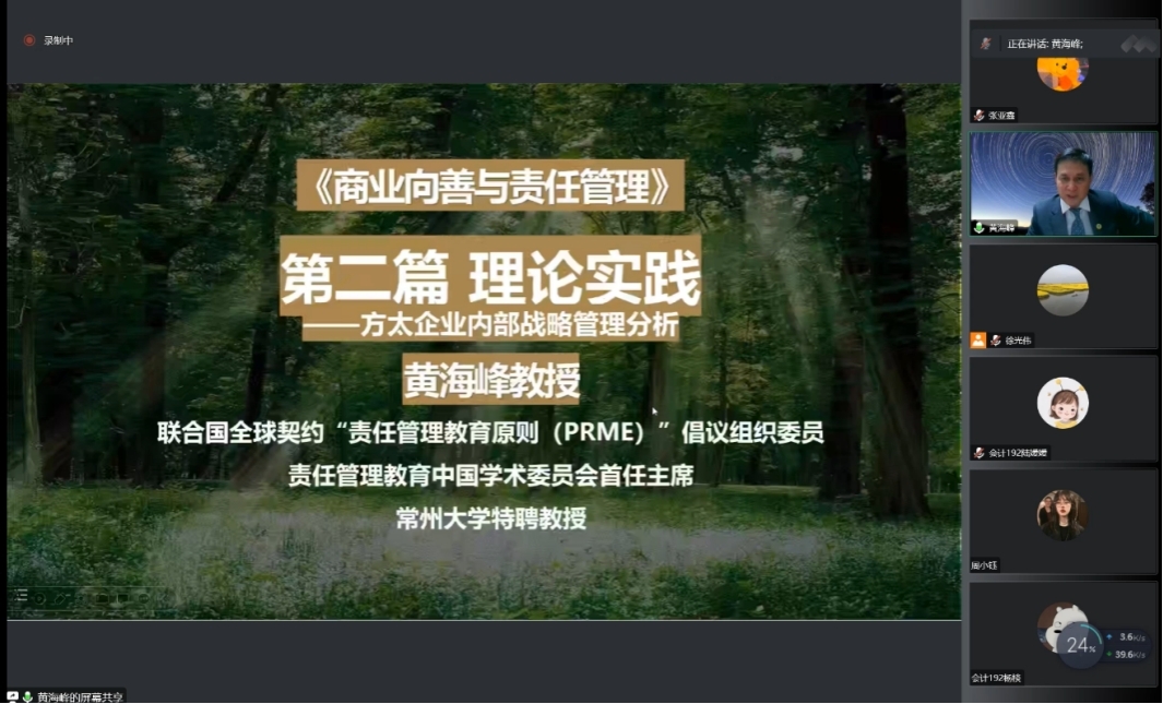 11月28日,商学院邀请特聘教授黄海峰举办《商业向善和责任管理》线上讲座。讲座由学院院长助理徐光伟博士主持,商学院近300位学生线上参与。 黄海峰教授首先以战略管理作为前言切入,结合时代发展趋势阐述了“商业向善”的转型大势。同时,黄海峰教授以方太集团为例,分析了新发展格局下企业如何全面向可持续经营模式转变,从而更好地履行社会责任,实现共同富裕。 本次讲座不仅增进了同学们对可持续发展经济学理论和商业向善的理解,也有助于同学们将“真、善、美”的商业向善教育本质融入社会实践,树立正确的商业价值观和人生价值观。(通讯员/陈珊 审核/林栋)
