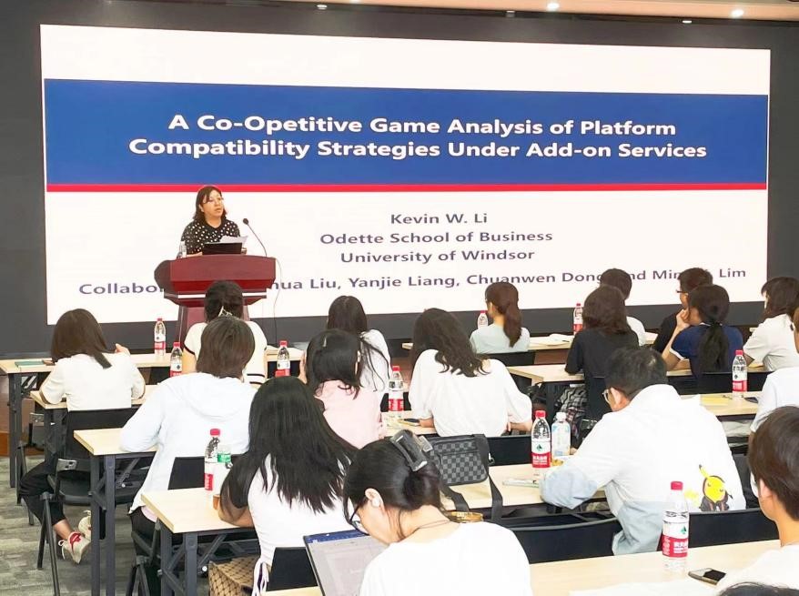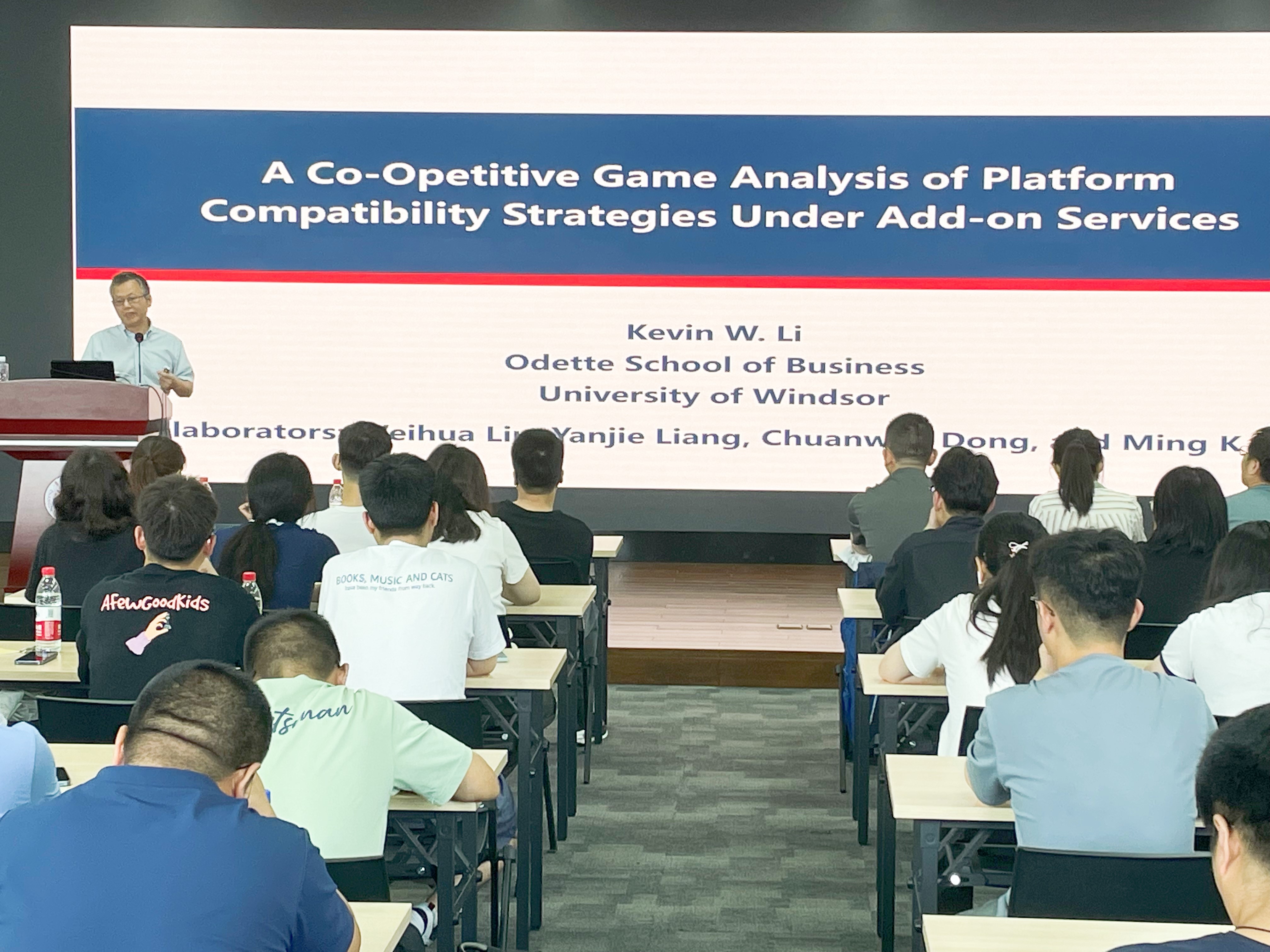 2023年6月10日,商学院 刘国钧管理学院特邀加拿大温莎大学Odette商学院管理科学教授李武作题为《附加服务下平台兼容策略的竞争博弈分析》的学术讲座。学院院长佟金萍主持讲座。 讲座伊始,佟金萍院长代表学院对李教授长期以来对我院工作的支持和帮助表示衷心感谢。李教授长期专注于供应链管理、决策理论与方法以及冲突分析等方面,本次学术报告主要包括六个部分:背景;文献综述;模型建立;主要发现;模型扩展;结论探讨。李教授强调,不同平台刻画利弊不同,并以滴滴、东风、apple、kindle等上市公司为例进行了深刻剖析,从双边角度为我们一一揭示附加服务降低了双方合作的意愿,提出效用函数,为我们理解双边平台竞争博弈提供了新的思路和方法。与会师生针对双边平台博弈的困惑与问题向李教授请教,李教授给予了悉心解答与指导。 商学院近百位老师和研究生于立言楼458多功能厅聆听讲座。