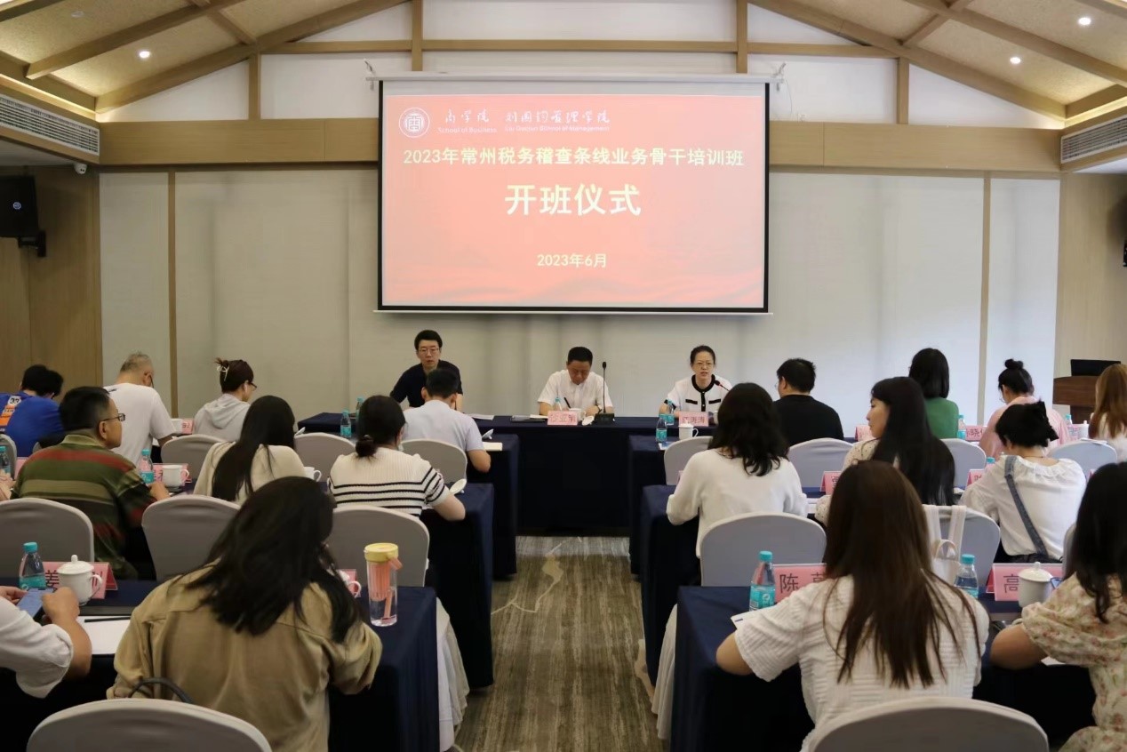 6月26日,2023年度常州税务稽查条线业务骨干培训班院顺利开班。常州税务稽查局局长沙亚清,副局长陈玉武,商学院党委书记江涛涛出席了开班仪式,开班仪式由商学院副院长林栋主持。 江涛涛对参加培训的学员表示欢迎,并表示本次培训班是为了提升常州税务稽查条线骨干的业务和管理能力的专题培训,也是加强推进校企合作、服务地方社会经济发展的有力举措。沙亚清对本次培训进行了开班动员,希望本次培训学员能够珍惜这次难得的线下培训机会,认真学习,补齐业务短板,积极与授课专家交流请教,释疑解惑,领会透精神,学到真本领,更好的为常州经济的高质量发展做出贡献。 本次培训为期三天,课程围绕二十大精神解读、践行程序正当原则化解稽查执法风险、骗税查处实务稽查选案和案源工作实务、中国经济的走势与未来发展机遇等多项专题开展了深入培训和讨论。