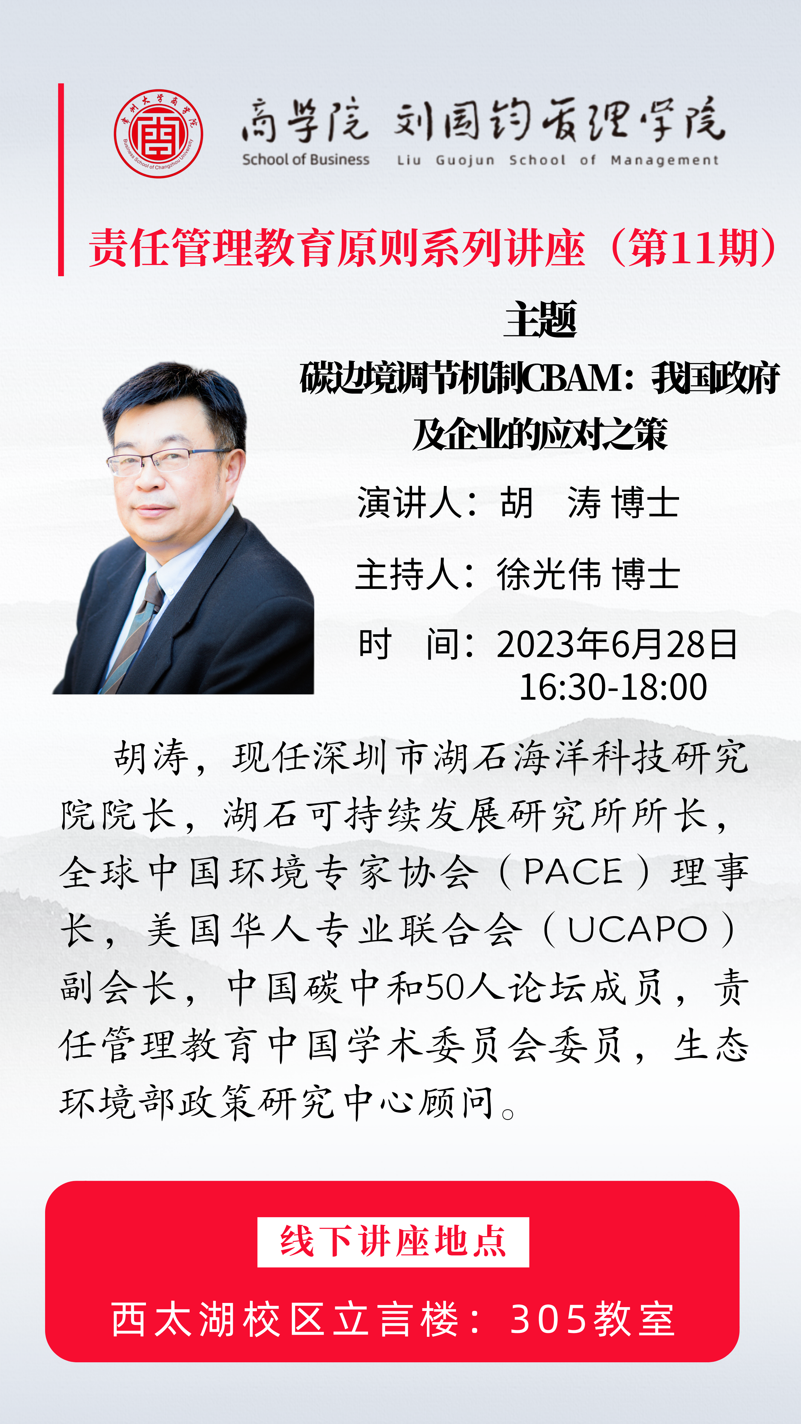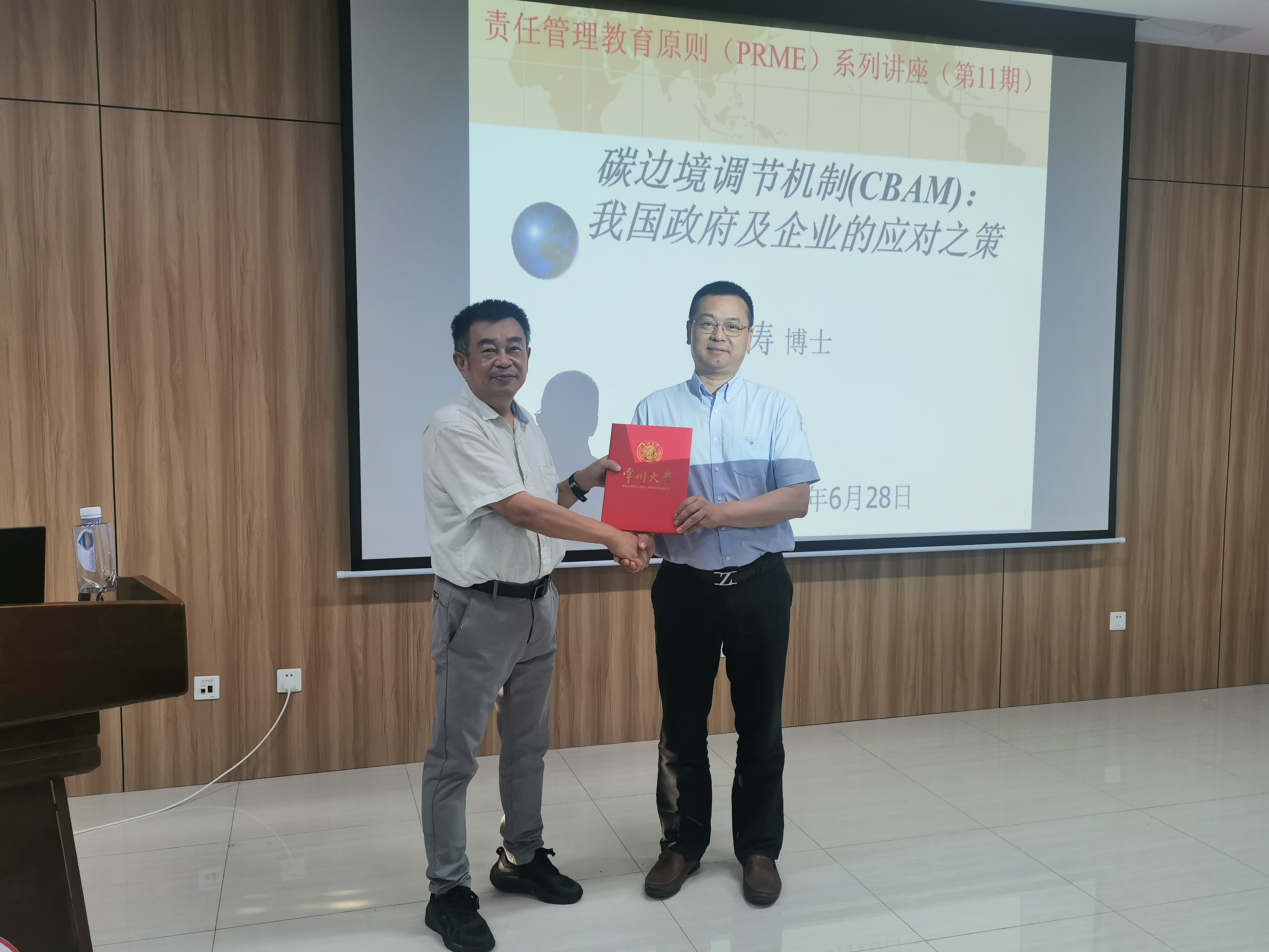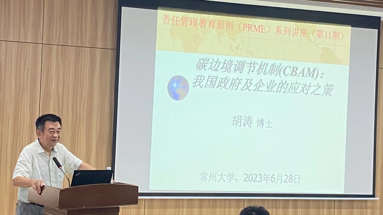 6月28日下午,商学院邀请深圳市湖石海洋科技研究院院长胡涛博士,作题为“碳边境调节机制(CBAM):我国政府及企业的应对之策”的讲座。讲座由副院长徐光伟主持,学院七十余名师生参与。 胡涛博士是现任湖石可持续发展研究所所长,全球中国环境专家协会(PACE)理事长,美国华人专业联合会(UCAPO)副会长,中国碳中和50人论坛成员,责任管理教育中国学术委员会委员,生态环境部政策研究中心顾问。 本次讲座包括以下几个部分:碳边境调节机制CBAM、我国政府的应对之策、我国企业的应对之策以及CBAM与责任管理教育PRME。胡涛博士提出,政府可以联合其他发展中国家,在多边场合推动“低碳环境产品倡议”投资贸易关税便利化。以此可以提高我国的绿色软实力,提升客观公正、负责任大国的国际形象,同时在国际投资贸易领域践行“人类命运共同体”、“生态文明”的理念。 讲座后,胡涛博士与大家就贸易相关问题进行交流讨论。最后,校党委常委、总会计师陆华良为胡涛博士颁发常州大学客座教授聘书。