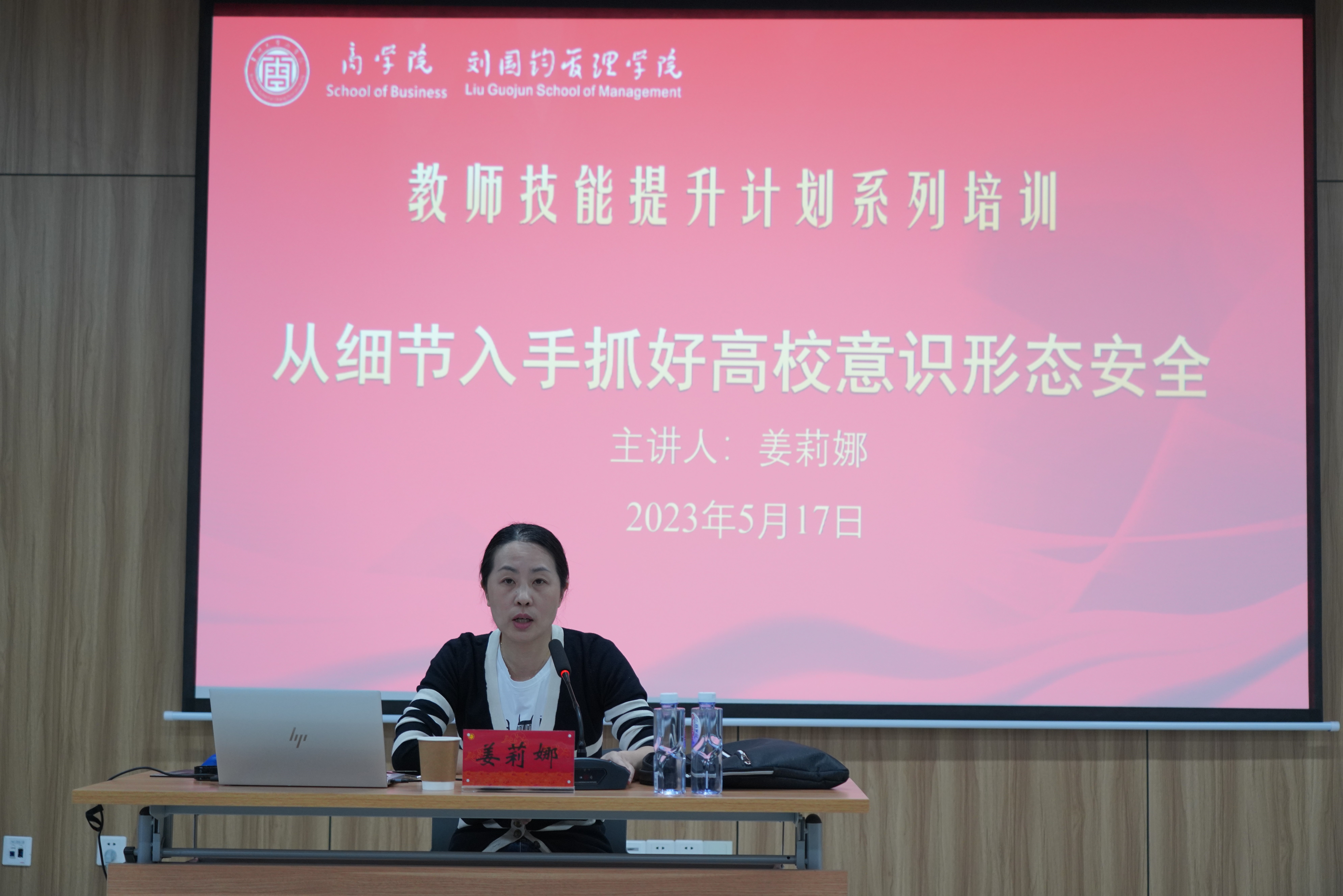 为提升学院教师意识形态工作能力,落实立德树人根本任务。2023年5月17日下午,学院邀请常州市公安局内保支队副支队长姜莉娜为我院作“从细节入手抓好高校意识形态安全”专题讲座。讲座由学院党委副书记林方毅主持,商学院全体教职工参加。 姜莉娜结合当下常州高校意识形态工作的基本情况,通过社会热点和典型案例梳理了当前高校意识形态问题的表现形式,进一步说明了加强意识形态工作的重要性,并就如何防范风险给出有力建议。 此次讲座让全体教职工进一步认识到意识形态工作极端重要性,有助于教职员工提升自身意识形态工作能力,切实解决好学院意识形态方面可能出现的问题,自觉把意识形态工作融入到日常教育教学工作中,营造良好育人环境。