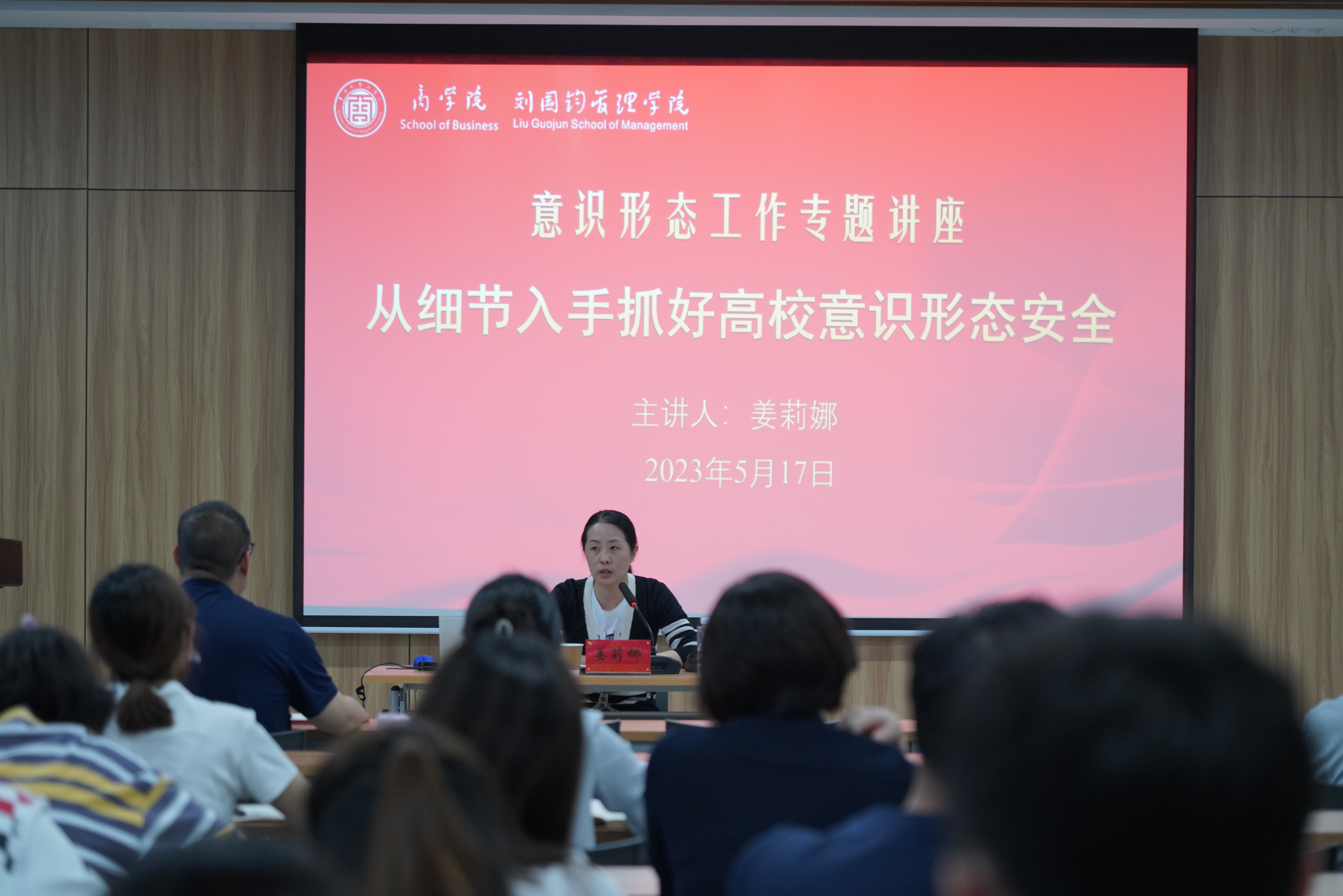 为进一步加强学院意识形态工作,增强教职工对意识形态工作的认识和理解。2023年5月17日下午,学院邀请常州市公安局内保支队副支队长姜莉娜为我院作题为“从细节入手抓好高校意识形态安全”专题讲座。讲座由学院党委副书记林方毅主持,商学院全体教职工参加。 在讲座中,姜莉娜结合当下常州高校意识形态工作的基本情况,剖析加强意识形态工作的重要性,利用社会热点和典型案例梳理当前高校意识形态问题的表现形式,并就如何防范风险给出了有力建议。 此次讲座姜莉娜对意识形态工作进行了深入浅出的讲解,具有很强的实践性和可操作性,让全体教职工认识到意识形态工作极端重要性,切实解决好学院意识形态方面可能出现的问题,自觉把意识形态工作融入到日常教育教学工作中,营造良好育人环境。