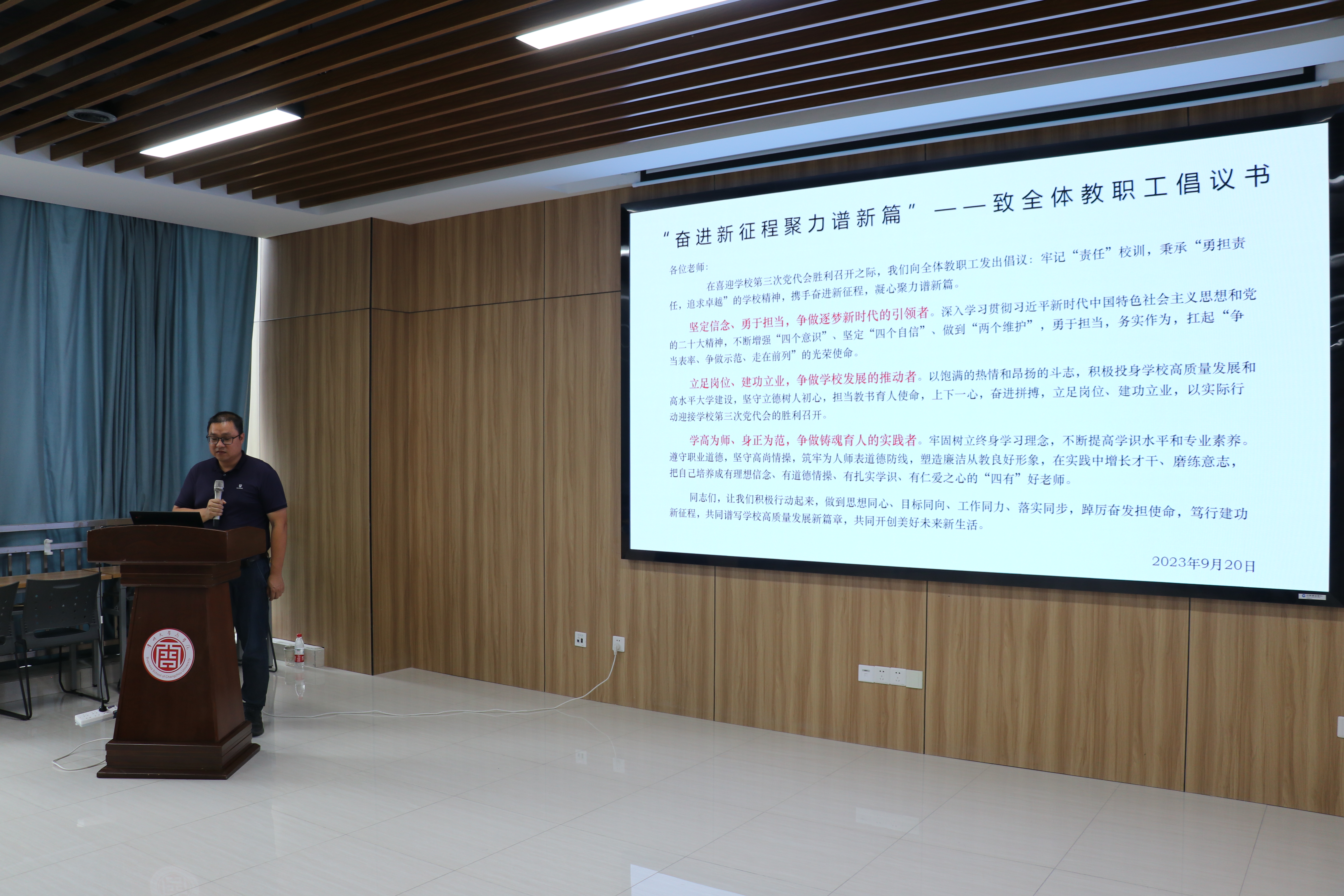 为深入学习贯彻习近平新时代中国特色社会主义思想和党的二十大精神,扛起“争当表率、争做示范、走在前列”的光荣使命,商学院分工会在基层开展“奋进新征程 聚力谱新篇”主题教育活动。 党委书记江涛涛对学校倡议书进行了解读。她表示,学院教师要要遵守职业道德,坚守高尚情操,筑牢为人师表道德防线,塑造廉洁从教良好形象,在实践中增长才干、磨练意志,把自己培养成有理想信念、有道德情操、有扎实学识、有仁爱之心的“四有”好老师。教师们要以饱满的热情和昂扬的斗志,积极投身到科研和教学岗位上,坚守立德树人初心,担当教书育人使命,上下一心,奋进拼搏,立足岗位、建功立业,以实际行动迎接学校第三次党代会的胜利召开。党委副书记林方毅带领全体教师宣誓,表示全院教师要同心协力,积极支持学校高质量发展,共同开创美好未来新生活。 此次主题教育活动是商学院分工会积极服务主战场系列活动之一,分工会将一如既往地从教学、科研及党建等各条战线上做好服务,共建美好商学院。