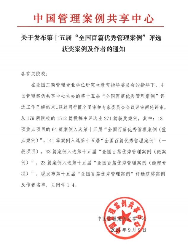 9月9日,全国MBA教育指导委员会公布了第十五届“全国百篇优秀管理案例”(简称“百优案例”)评选结果。常州大学商学院何光远博士等提交的参评案例成功入选第十五届“全国百篇优秀管理案例(微案例)”。 “百优案例”作为全国工商管理案例领域的最高奖项,是由全国MBA教育指导委员会指导、中国管理案例共享中心主办,该奖项连续被纳入教育部学科评估指标体系和全国专业学位水平评估指标体系,对于提升人才培养质量和推动学科专业发展具有重要意义。本届评选吸引了来自全国179所院校的1512篇案例参评。经过严格的匿名函审和专家委员会会议评审,最终确定了来自66所院校的141篇案例入选“百优案例(一般项目)”、来自31所院校的43篇案例入选“百优案例(微案例)”。 常州大学商学院始终坚持“用本土案例讲好本土管理故事”的基本理念,多年来致力于高质量案例的开发工作,依托优秀企业开展案例教学工作,定期组织师生前往企业参访,努力为企业与师生搭建沟通渠道,实现了学院教学价值、社会价值和赋能价值三者的有效融合。自常州大学MBA教学点开设以来,商学院已经组织了多批次的管理案例交流活动。本届百优案例的成果不仅展示了学校案例开发工作的新进展,也对我校的学科建设尤其是案例建设起到了重要的推动作用。(通讯员/王怡菲 审核/龙涌澜)