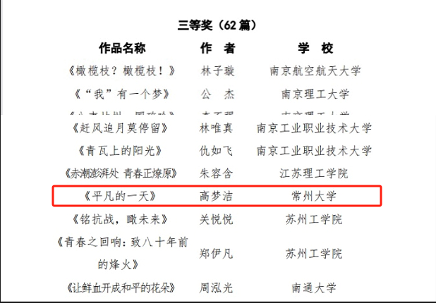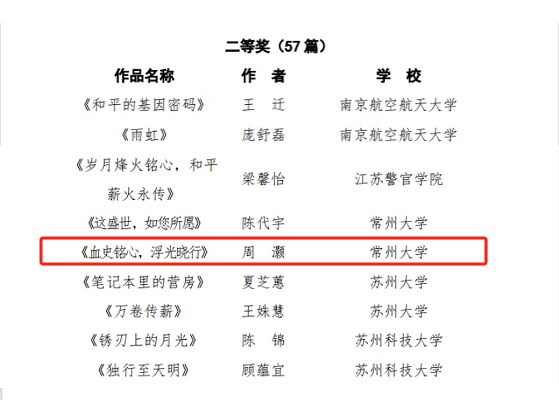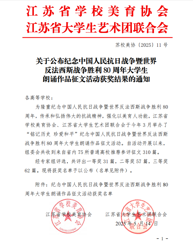 为纪念中国人民抗日战争暨世界反法西斯战争胜利80周年,传承和弘扬伟大的抗战精神,强化以美育人功能,江苏省学校美育协会、江苏省大学生艺术团联合会于今年3月举办了“铭记历史 珍爱和平”纪念中国人民抗日战争暨世界反法西斯 战争胜利80周年大学生朗诵作品征文活动,商学院学生喜获省二、三等奖。 春季开学以来,教务处、校团委广泛宣传动员,学院团委积极动员学生踊跃投稿,经过校内评审,学院共有4篇作品参与全省评选。最终,信管241班周灏作品《血史铭心,浮光晓行》荣获省二等奖、营销242班高梦洁作品《平凡的一天》荣获省三等奖。 据悉,自活动开展以来, 组委会共收到来自省内75所普通高校推荐参评征文310篇。 经专家组评选,共评出一等奖31篇,二等奖57篇,三等奖 62 篇。(通讯员/王怡菲 审核/龙涌澜)