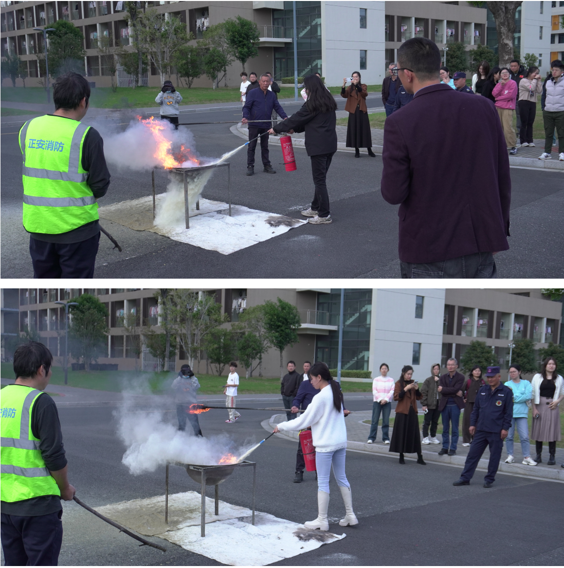 活动中,校区治安消防科负责人首先结合近年来高校典型火灾案例,系统讲解了火灾成因、预防措施、扑救方法及疏散逃生要点,并详细介绍常见灭火器的类型、检查标准与操作规范,现场演示了干粉灭火器的正确使用方法。随后,在校区治安消防科的指导下,师生依次进行油盆灭火实操演练。