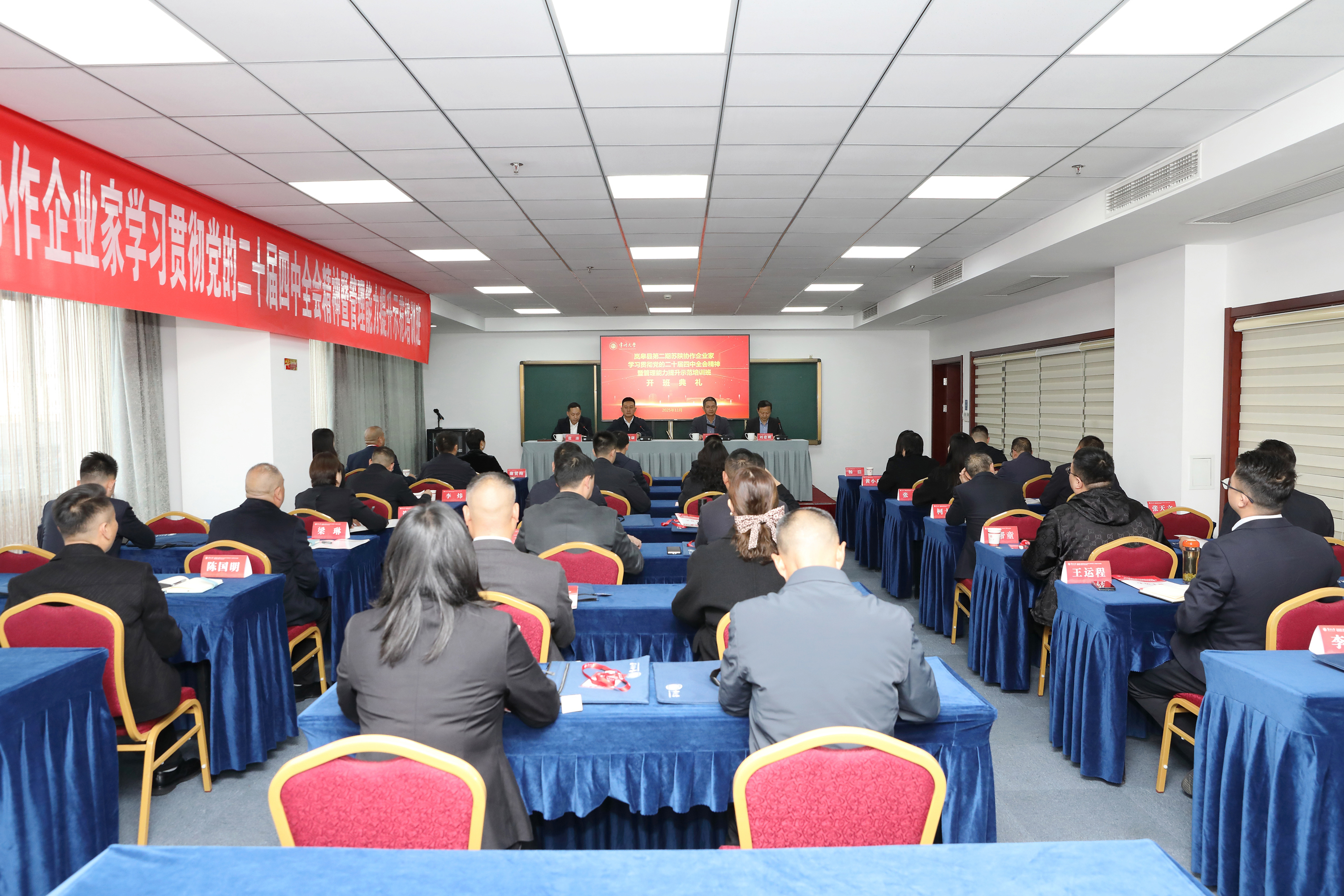 11月11日,陕西省岚皋县苏陕协作企业家学习贯彻党的二十届四中全会精神暨管理能力提升示范培训班在我校顺利开班。岚皋县委副书记刘晓康,县委常委、统战部部长张涛,常州大学商学院党委书记龙涌澜、副院长刘建刚参加开班仪式。岚皋县域部分领导干部和民营企业家30余人参加本次培训。 开班仪式上,龙涌澜对参训学员表示热烈欢迎,他表示,本次培训是我院第二次承办岚皋县苏陕协作企业家培训班,对岚皋各级各部门及企业家朋友们长期以来对商学院事业发展给予信任和支持表示感谢,并希望通过本次培训,进一步加深与岚皋县企业家的合作,更好地发挥学院智力优势,彰显学院责任担当。 刘晓康在开班动员讲话中指出,本次培训是学习贯彻党的二十届四中全会精神、提升县域领导干部和民营企业家应对市场挑战、推动产业升级的专项培训,希望全体学员要在“学深悟透”上下功夫、在“学以致用”上见真章、在“严守纪律”上作表率,把常州大学的智力资源转化为产业升级的“助推器”,在苏陕协作的广阔舞台上书写新的篇章。 本次培训为期5天,课程紧紧围绕党的二十届四中全会精神、数字背景下的企业商业模式创新、贸易战烽烟中的中国农业、AI赋能企业发展、客户开发与销售谈判等专题进行,并将安排现场教学及两地企业家交流座谈会。(通讯员/郭梦梦 审核/龙涌澜)