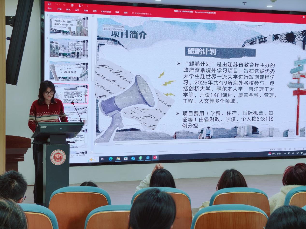 11月12日,学院在立言楼MBA中心举行国(境)交流项目宣讲会。国际交流处项目科顾倩媛老师应育见世界辅导员工作室为同学们详细解读相关项目政策,并邀请两名学生代表分享境外交流经验。 顾倩媛以“中国心·世界眼”为题,详细介绍了我校与全球多所知名高校及机构建立的合作关系,系统梳理了涵盖学期交换、短期研修、实习实践等不同类型的交流项目,并就项目优势、申请条件、选拔流程、学分认定以及奖学金政策等同学们普遍关切的问题进行了深入浅出的解读。 经验分享环节,2023级会计学专业本科生杜崇瑜、2023级工商管理学专业研究生李月分别结合自身的境外交流经历,生动讲述了她们在异国他乡的学习挑战、文化体验与生活趣事,分享了交流经历对能力提升和个人成长的意义。(通讯员/王怡菲 审核/王彩芳)