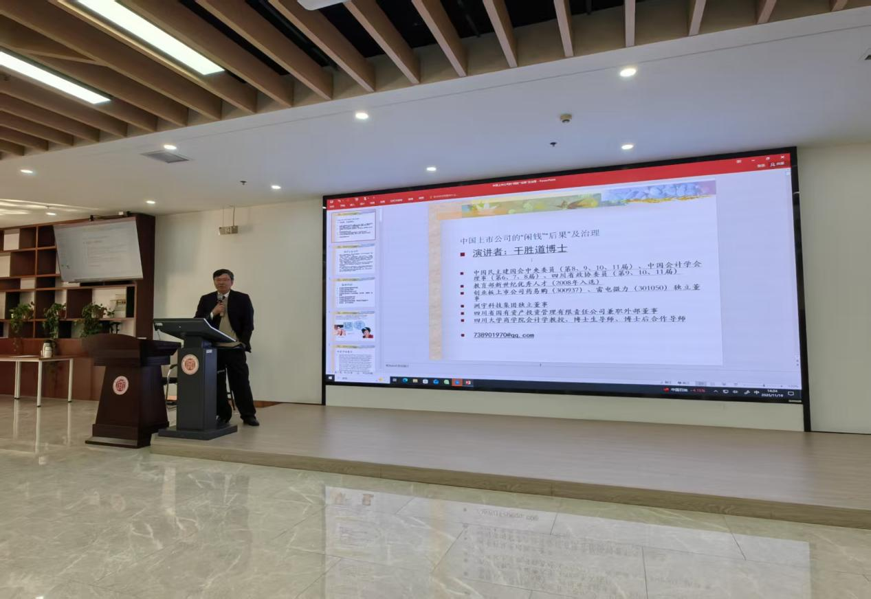 11月19日下午,常州大学商学院“潘序伦会计论坛大讲堂(第6期)”在西太湖校区顺利举行。四川大学商学院会计学教授、博士生导师干胜道应邀作题为“中国上市公司的‘闲钱’‘后果’及治理”的专题讲座。商学院教师代表及全体研究生参加,讲座由会计系主任郭凌军主持。 干胜道教授从自由现金流理论入手,系统梳理了“闲钱”的概念内涵、形成机制及其在中国资本市场中的特殊表现。他指出,自由现金流不仅是财务分析的重要指标,更深刻关联企业资源配置、公司治理结构与代理成本等关键问题。在结合经典理论与国内研究的基础上,干教授重点分析了上市公司在股权结构、再融资安排、利润分配及重大投资决策中存在的“可控”与“不可控”现金使用空间,剖析了由此带来的资源误配、隐性支出、掏空行为等经济后果,并从完善公司治理、强化信息披露、引入EVA等机制三个维度,提出了应对“闲钱”问题的治理思路。同时,他还结合自身研究,梳理了自由现金流在企业绩效、管理者薪酬、金融化、社会责任、国企薪酬公平、高管消费、腐败与研发投入等领域的前沿研究方向,为研究生后续选题与方法运用提供了有益参考。 在互动交流环节,现场气氛热烈而理性,师生们围绕自由现金流的界定、治理难点及未来研究空间踊跃提问。干胜道教授逐一回应,并以“从学术走向人生”的寄语勉励同学们在理论学习中保持问题意识,在科研实践中锤炼独立思考与严谨分析能力。本次讲座内容充实、视野开阔,不仅加深了师生对中国上市公司自由现金流问题及其治理路径的理解,也为商学院公司财务与公司治理相关研究注入了新的学术活力。(通讯员/郭梦梦 审核/龙涌澜)
