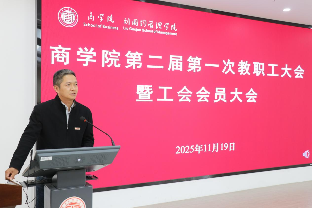 11月19日下午,常州大学商学院刘国钧管理学院第二届第一次教职工大会暨工会会员大会在西太湖校区立言楼MBA教育中心召开,商学院全体教职工参加会议,党委副书记王彩芳主持会议。 会上,院长佟金萍代表学院作年度工作报告,全面梳理了过去一年在党建引领、人才培养、学科建设、科研组织、师资队伍和社会服务等方面取得的成绩,并提出2026年的发展重点。分工会主席潘伟强汇报了分工会年度工作,介绍了工会在教职工关怀与福利保障、文化与集体活动建设、师德师风与职业发展支持等方面的主要举措。何光远老师对学院年度财务运行情况向大会作了说明,进一步提升了学院治理的公开度与透明度。院党委书记龙涌澜在总结讲话中充分肯定了学院一年来取得的成绩,对全体教职工的辛勤付出表示感谢,并对学院下一阶段的发展提出明确要求。他强调,要准确把握新发展阶段要求,始终坚持立德树人根本任务,不断提升办学治院水平,推动学院事业再上新台阶。学院各系部及管理部门围绕大会内容开展分组讨论,形成多项提案,为学院“十五五”时期事业高质量发展进一步夯实了基础。 此次会议的召开处在学校“十四五”收官、“十五五”开局的关键节点,是学院总结年度工作、凝聚发展共识、明确前进方向的重要会议,对推进学院治理体系完善和事业高质量发展具有重要意义。(通讯员/郭梦梦 审核/龙涌澜)