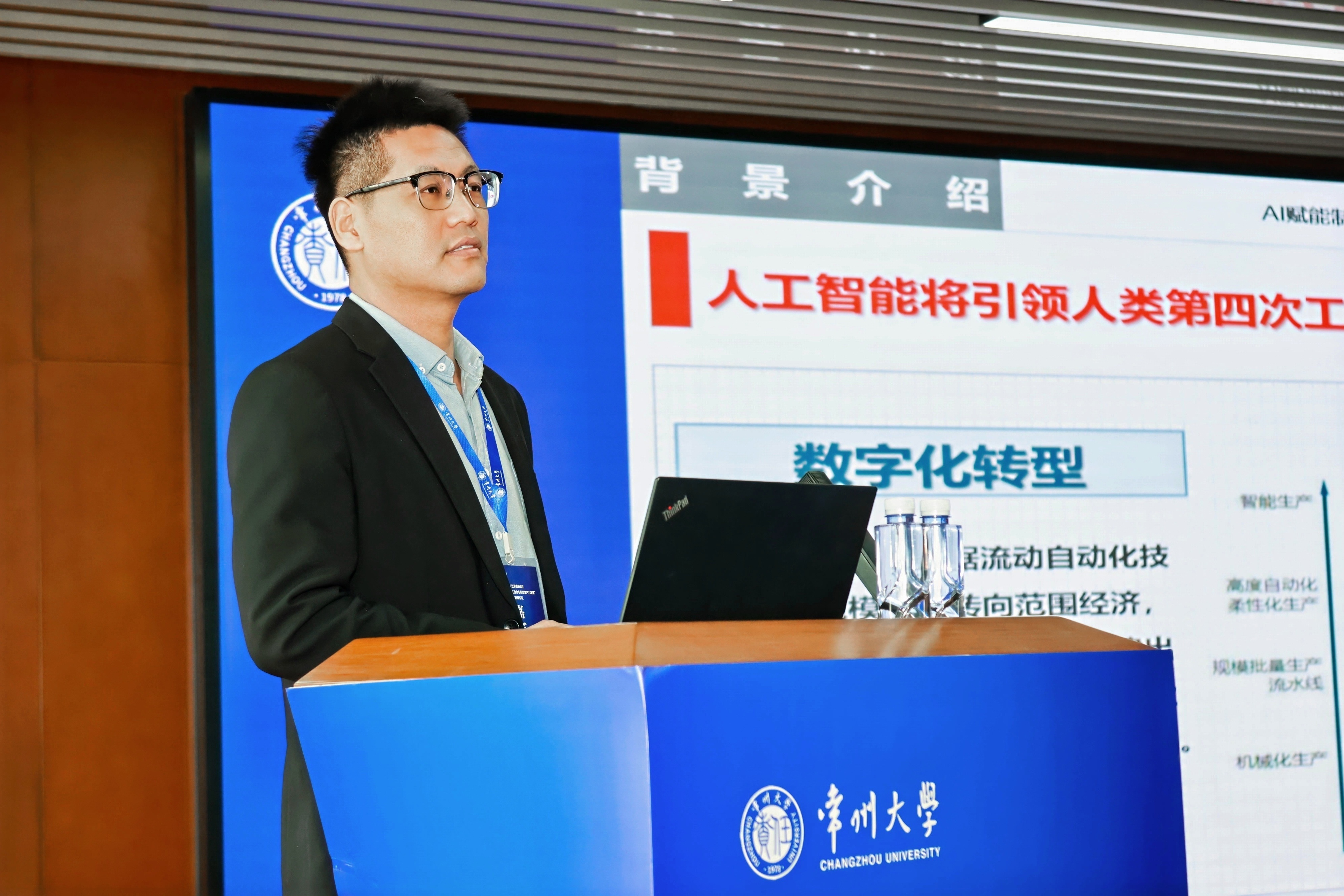 三等奖获奖者与颁奖嘉宾合影 主题报告环节由常州大学商学院 刘国钧管理学院副院长刘建刚教授和徐光伟教授分别主持。北京化工大学信息科学与技术学院韩永明教授作题为《智能制造——AI赋能制造业:从理论到实践的技术革命》的大会报告,深入解析了人工智能技术在制造业转型中的应用路径与实践成果。
