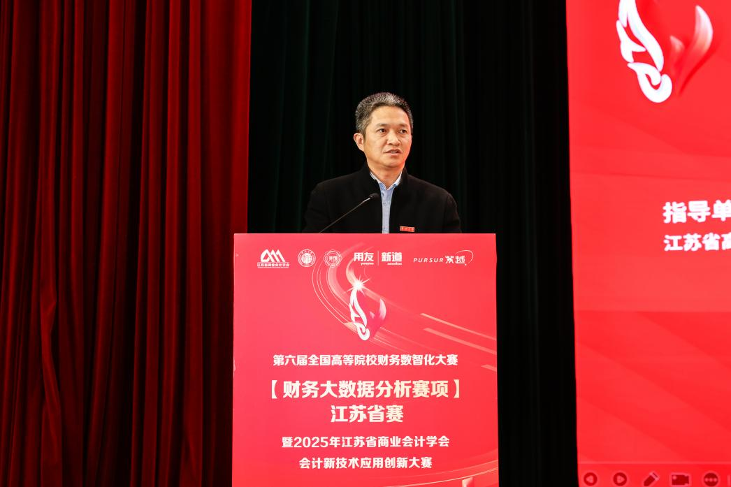 新道科技江南区总经理兼江苏分公司总经理任子宜致辞 江苏省商业会计学会常务副会长刘正兵宣布大赛正式启动,并指出,大赛对标新技术,对接国赛新标准,面向企业财务管理真实场景,提升广大选手驾驭新工具,运用知识与技能解决实际问题的能力,将会进一步加强院校间的数字财经教学交流,为发现、培养和选拔数字财经服务人才提供舞台,对于提高教育质量、深化专业改革,具有十分重要的意义。